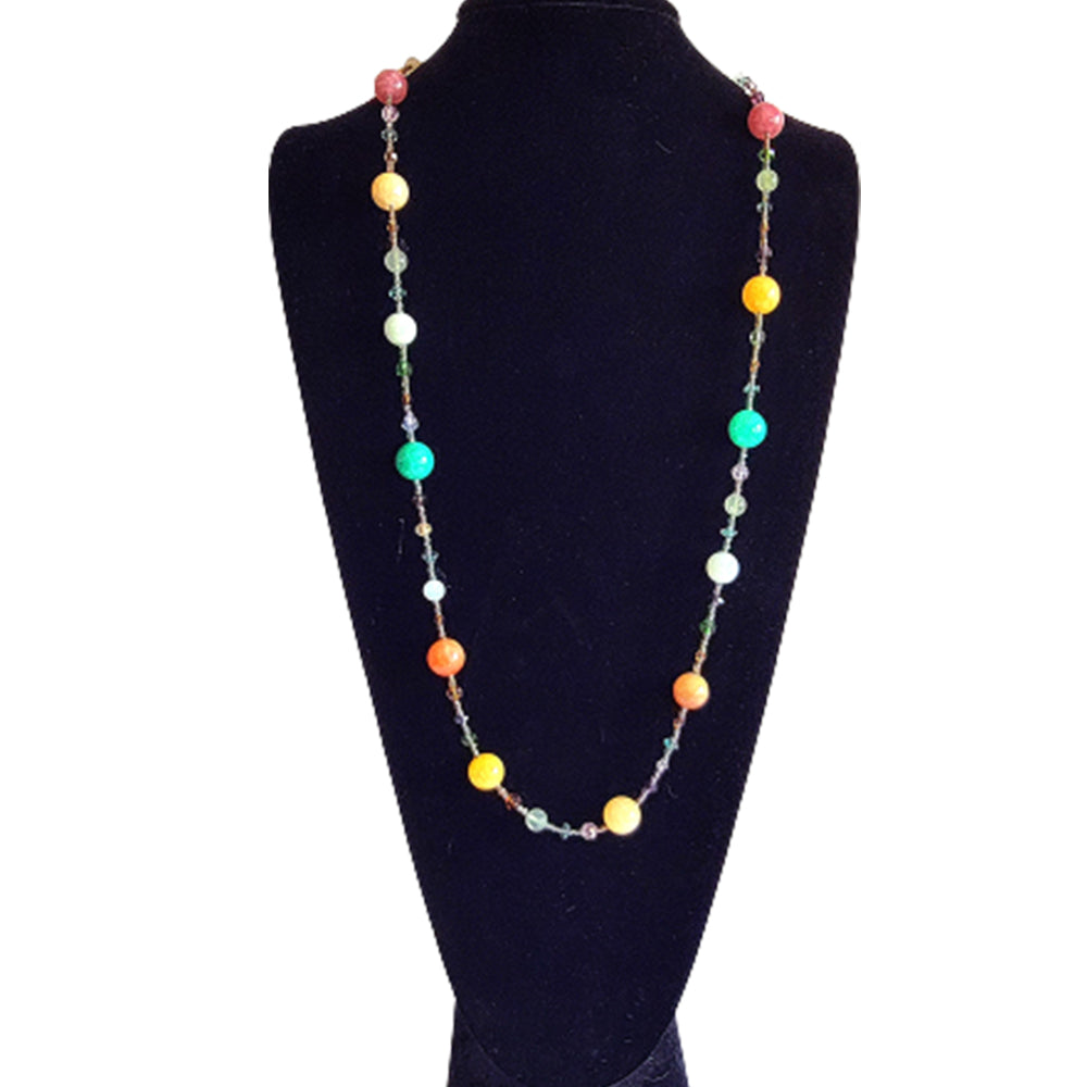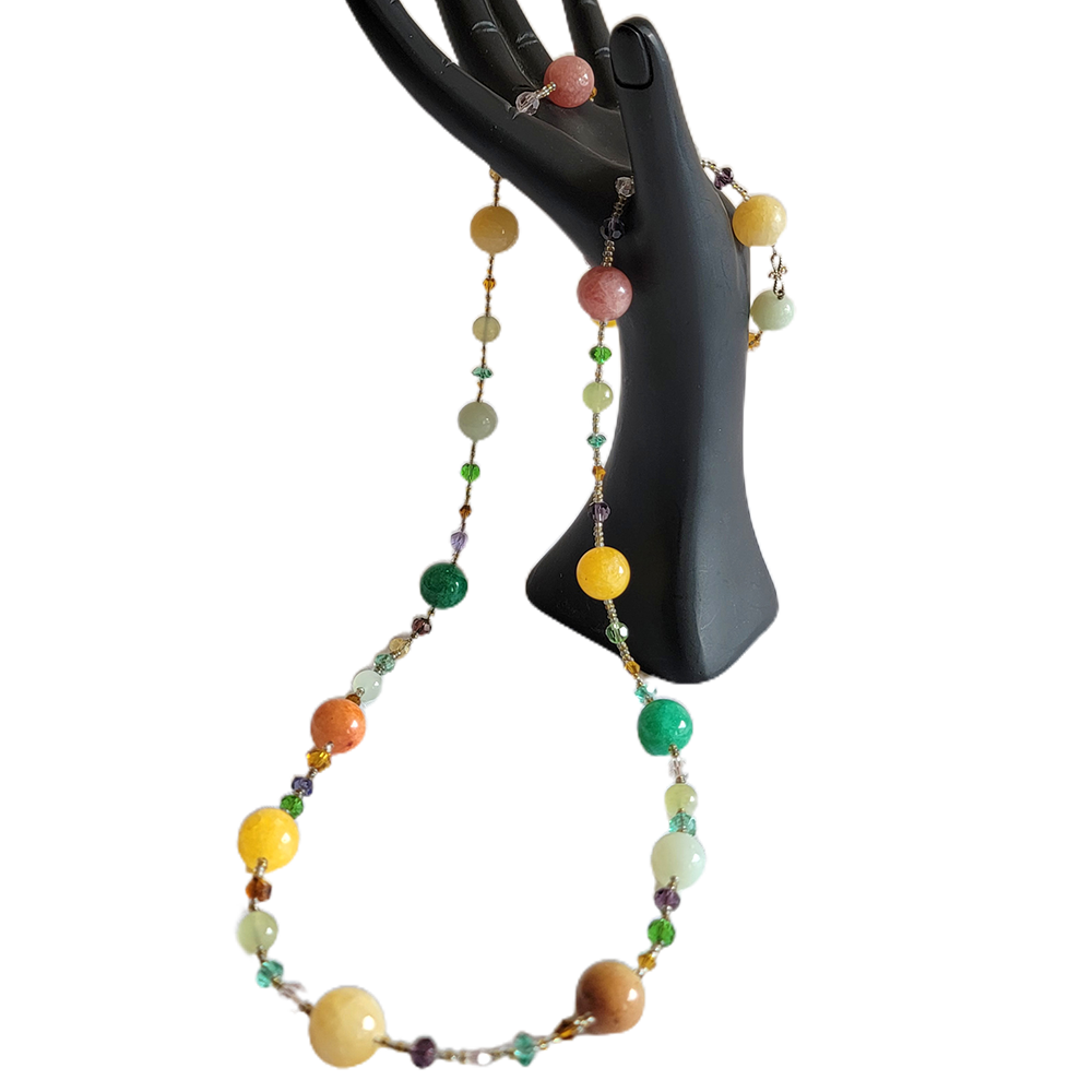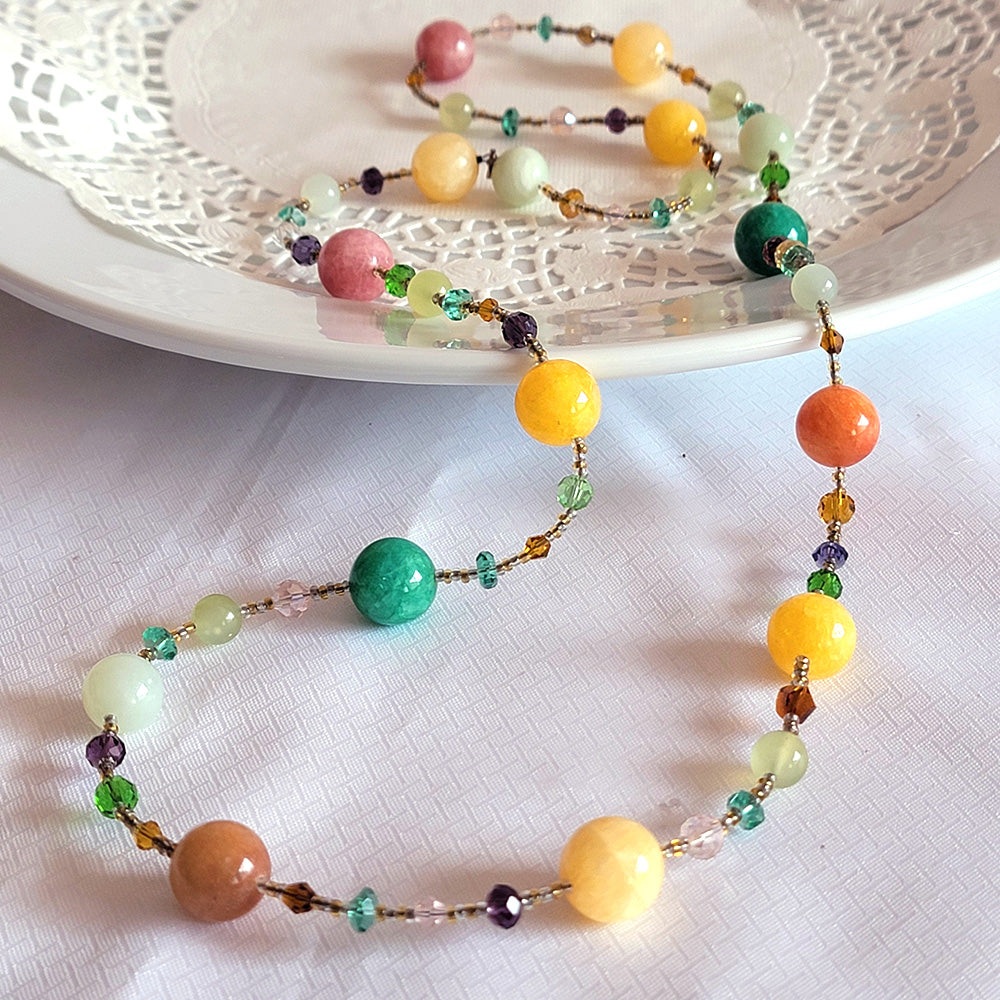 This product is a necklace made of round jade (12mm) and crystal beads. The necklace has a length of 34 inches, making it convenient to wear without clasps. The variety of pastel-toned jades, reminiscent of delicious candies, exudes a bright and lovely feeling. It goes well with casual attire and makes a versatile gift suitable for women of all ages.