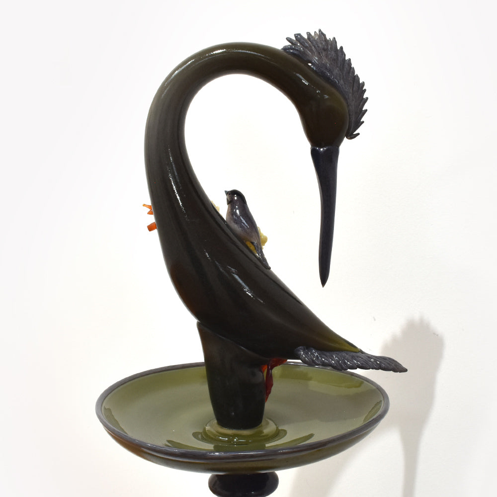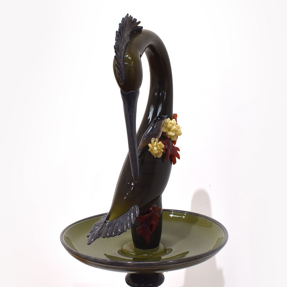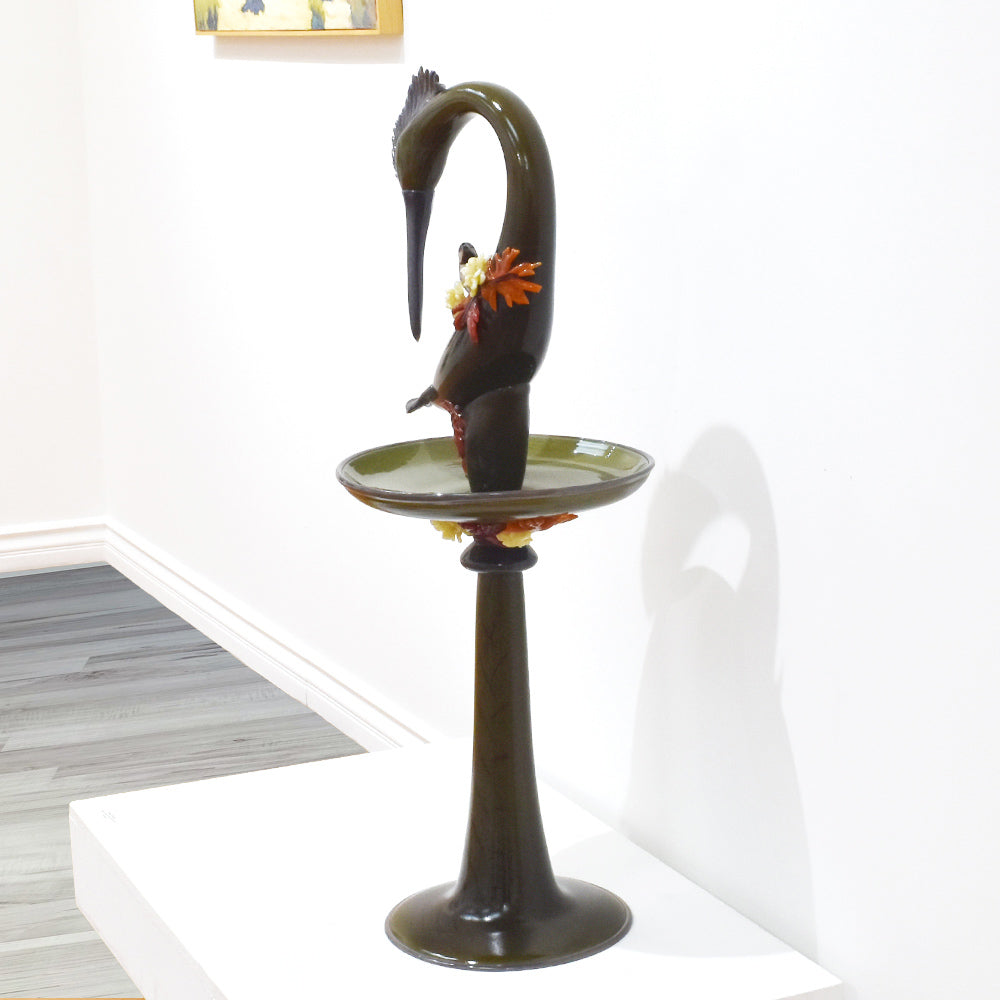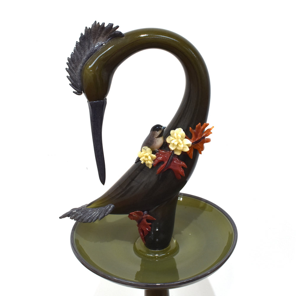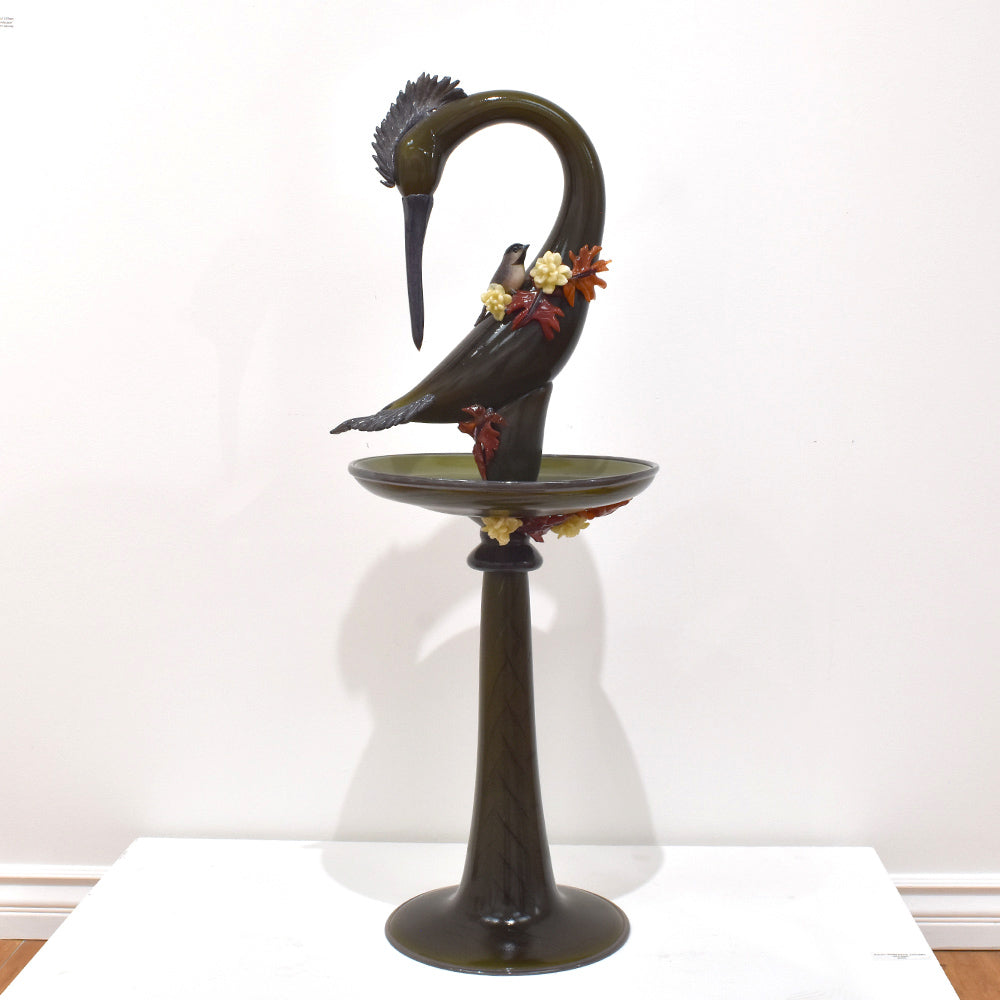 The bird bath, featuring realistic details, incorporates meticulously crafted partial depictions connected to the artwork, all made using blown glass techniques. It exudes a lovely feel and elegant beauty.
