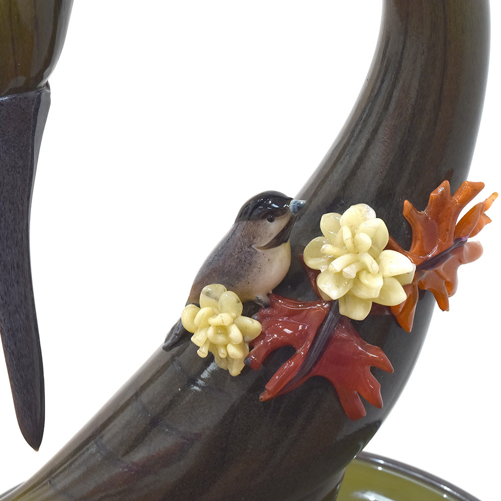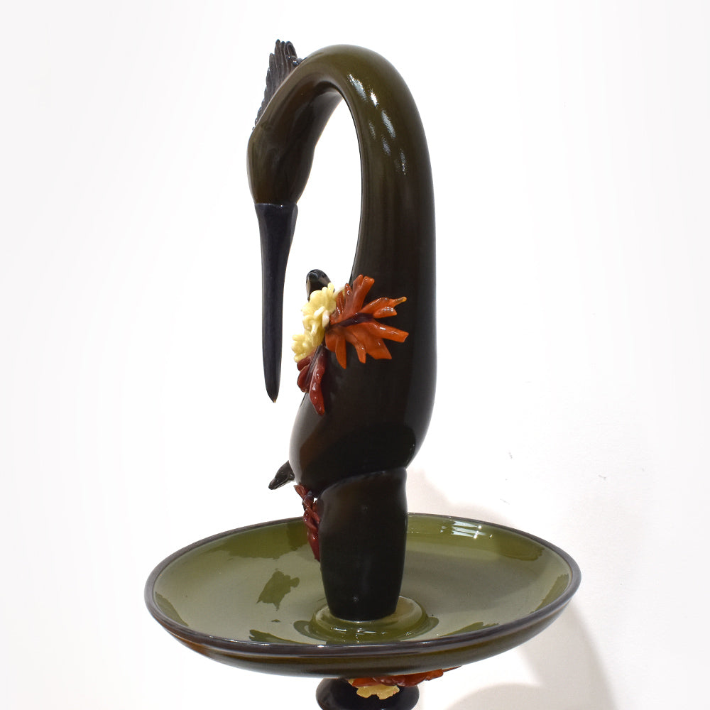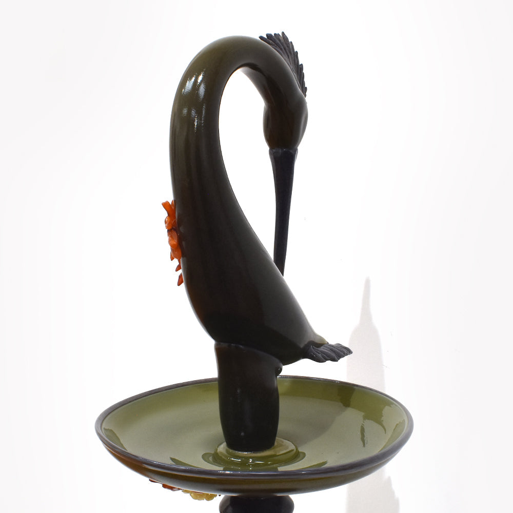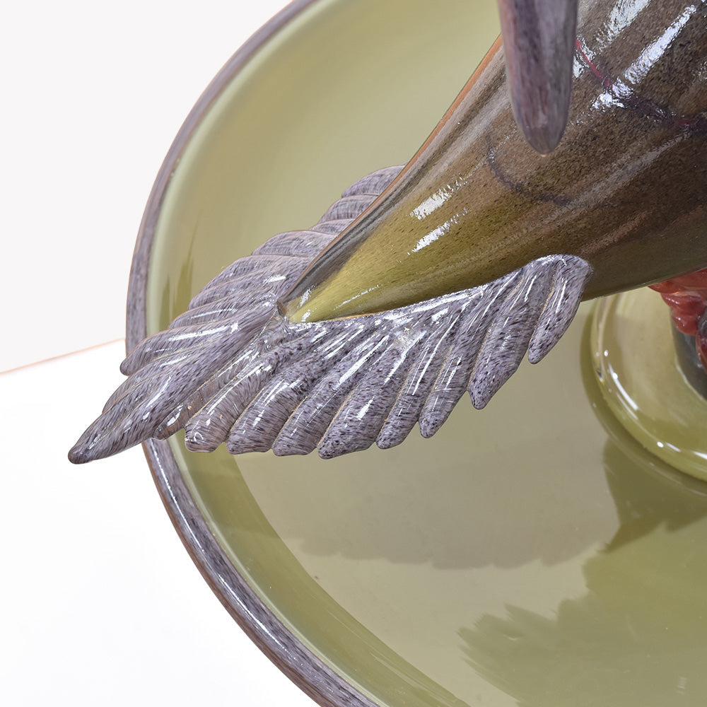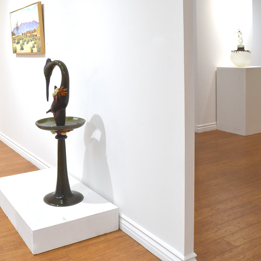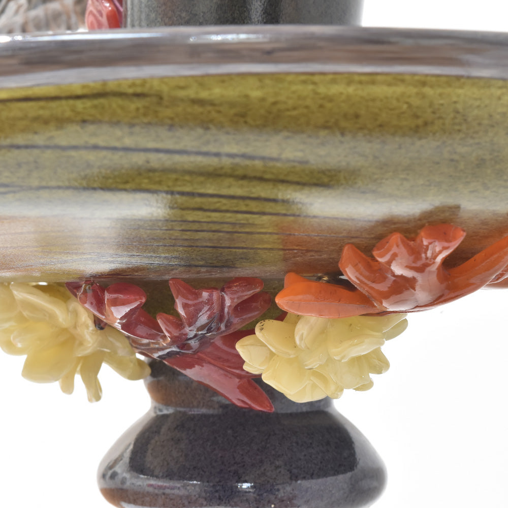The bird bath, featuring realistic details, incorporates meticulously crafted partial depictions connected to the artwork, all made using blown glass techniques. It exudes a lovely feel and elegant beauty.