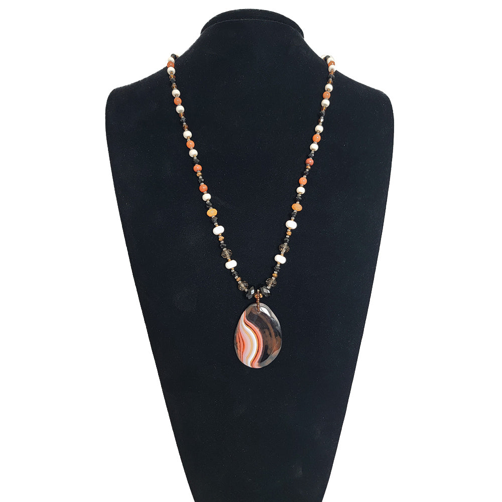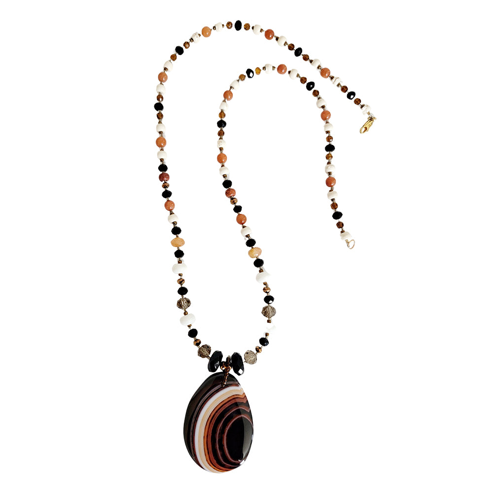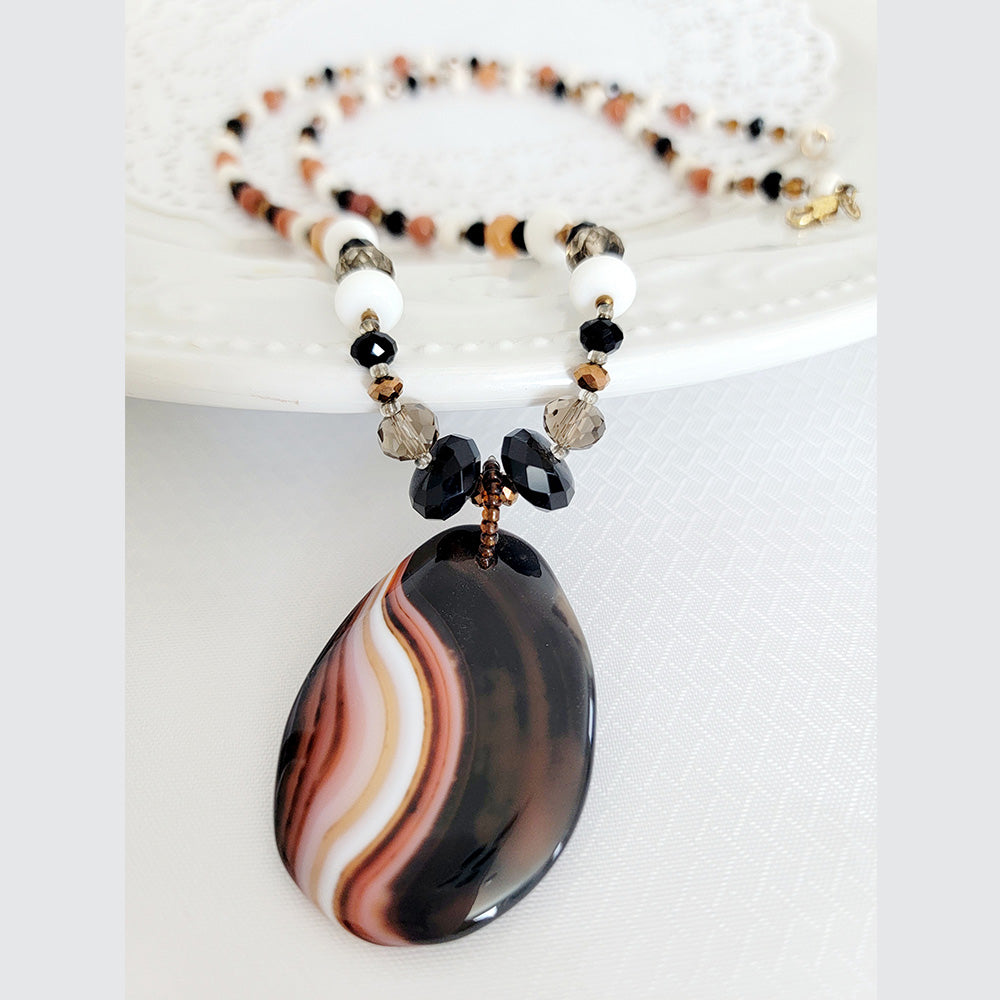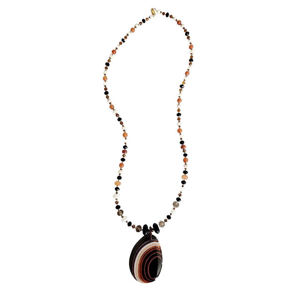 This product is inspired by patterns formed in natural stones with brown tones. The appropriate size and smooth oval shape provide a comfortable yet earthy feel. Materials used in the 26-inch piece include onyx, agate, magnesite, and crystal. The combination of earth-toned colors complements the natural stone pendant, creating a balanced and serene vibe that appears ordinary yet sophisticated.