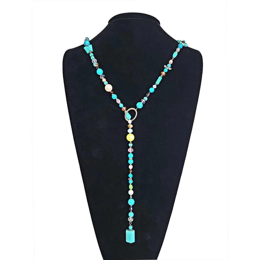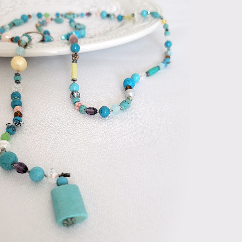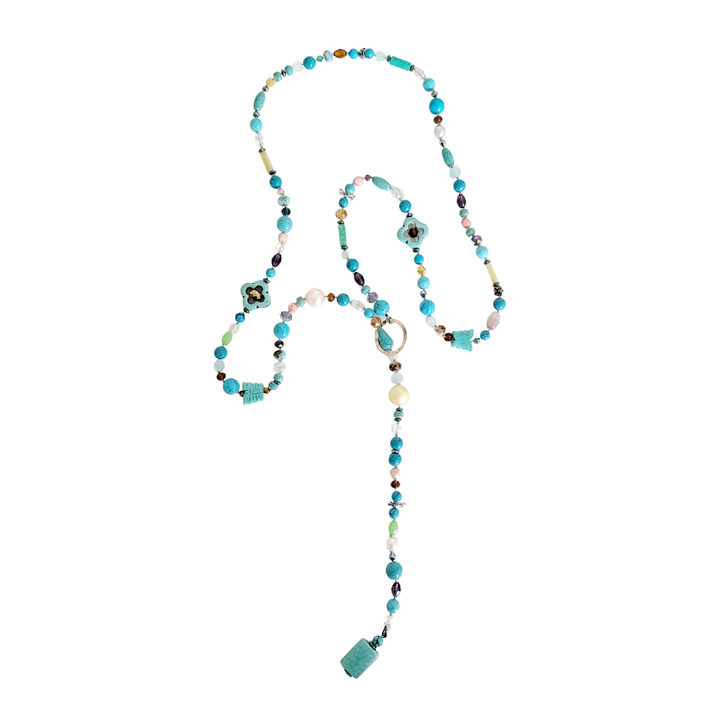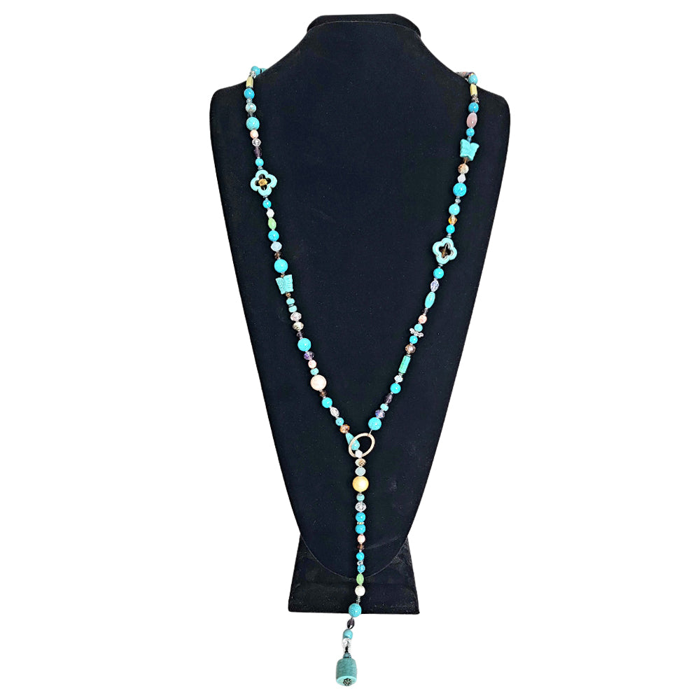 In a 42-inch long product, round turquoise stones ranging from 6mm to 10mm in diameter dominate, complemented by other shapes such as butterflies, pearls, crystals, and metal beads, all designed in a free-spirited manner. By attaching a ring at the end of the necklace, it can be worn at the desired length, creating a modern and chic atmosphere.