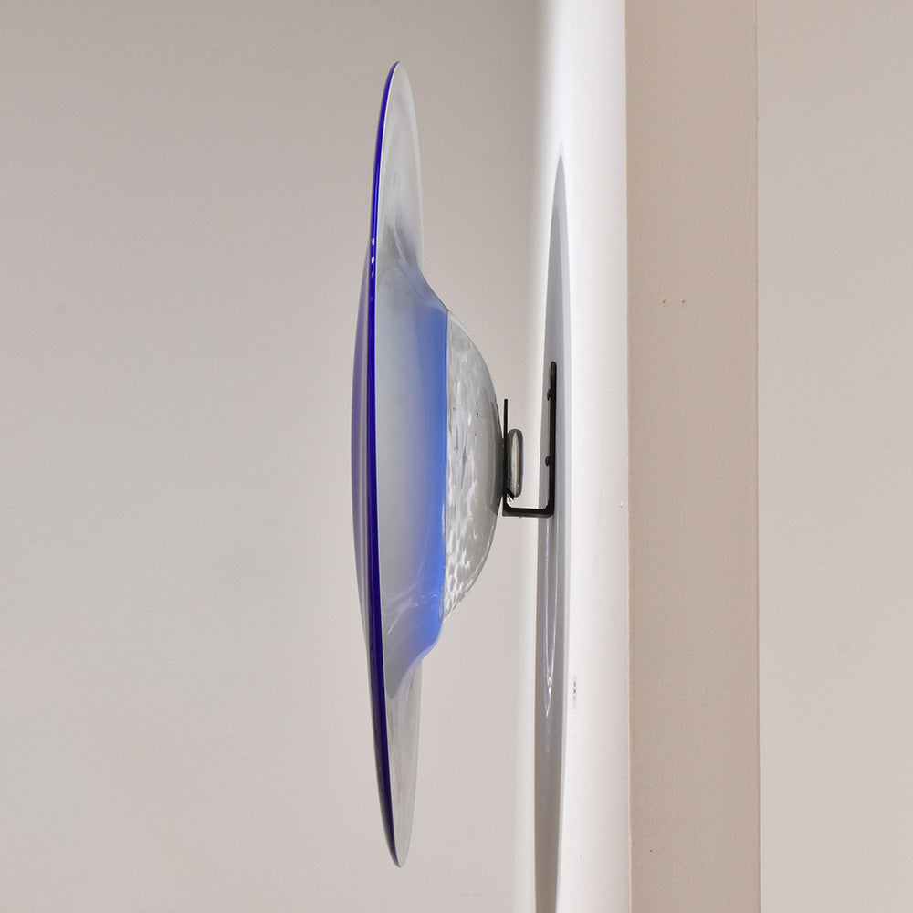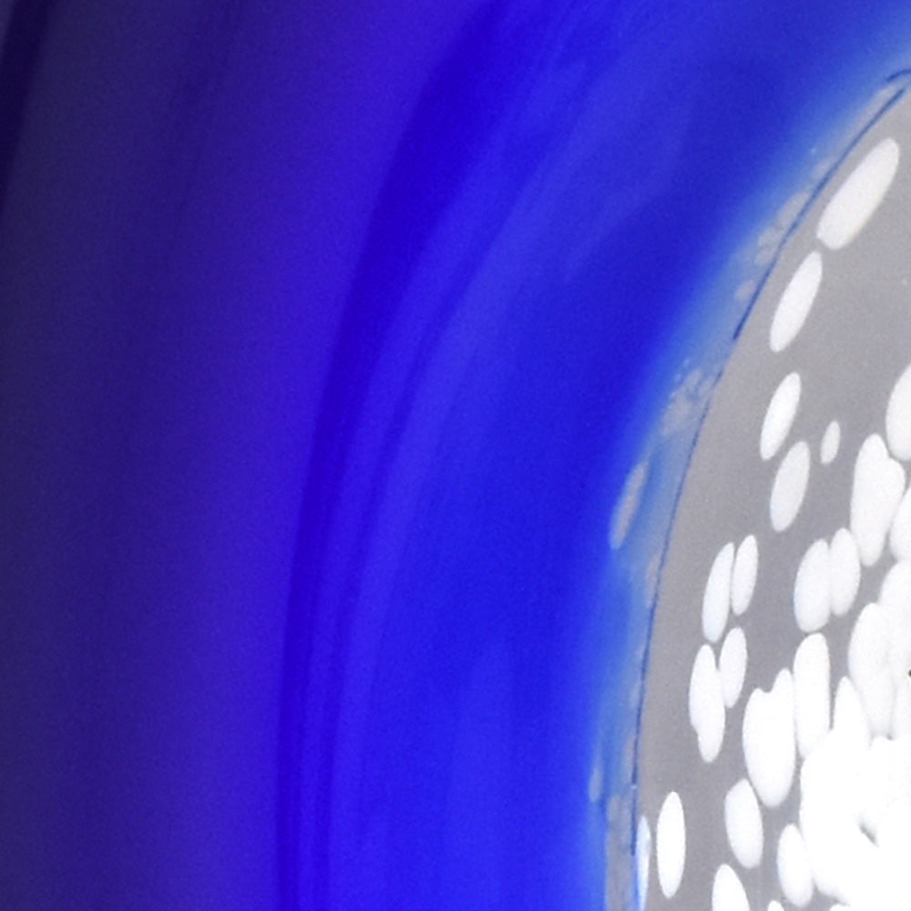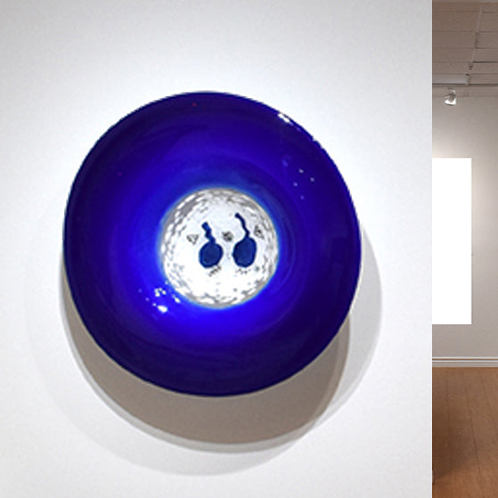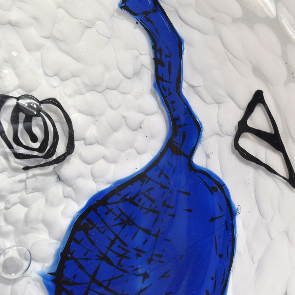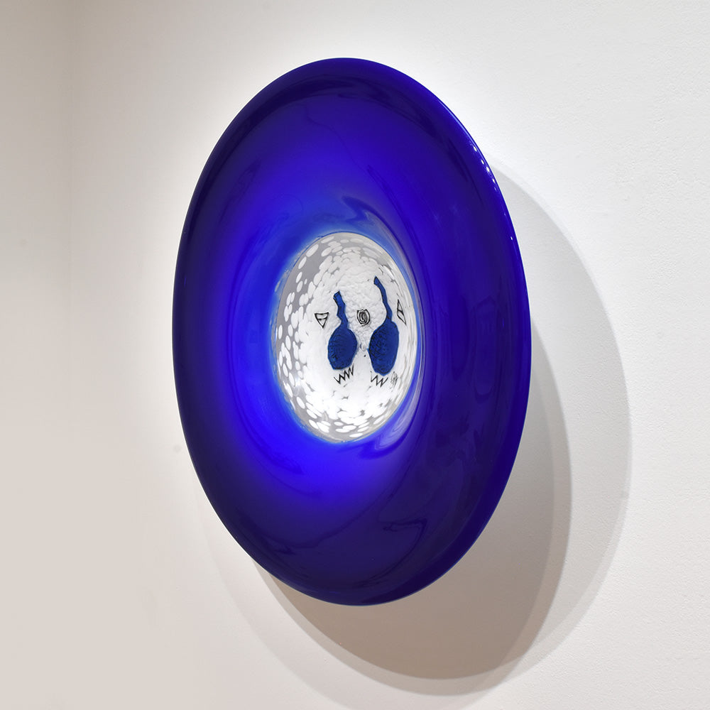 This artwork is a blown glass piece with a diameter size of 29 inches, created in a 2-D format suitable for hanging on the wall. The large circular plate, with its simple form and deep blue color combination, evokes boldness and a modern feel for the viewer. While simple, the insertion of abstract imagery, along with the transparency of the glass, becomes the focal point of this piece.
