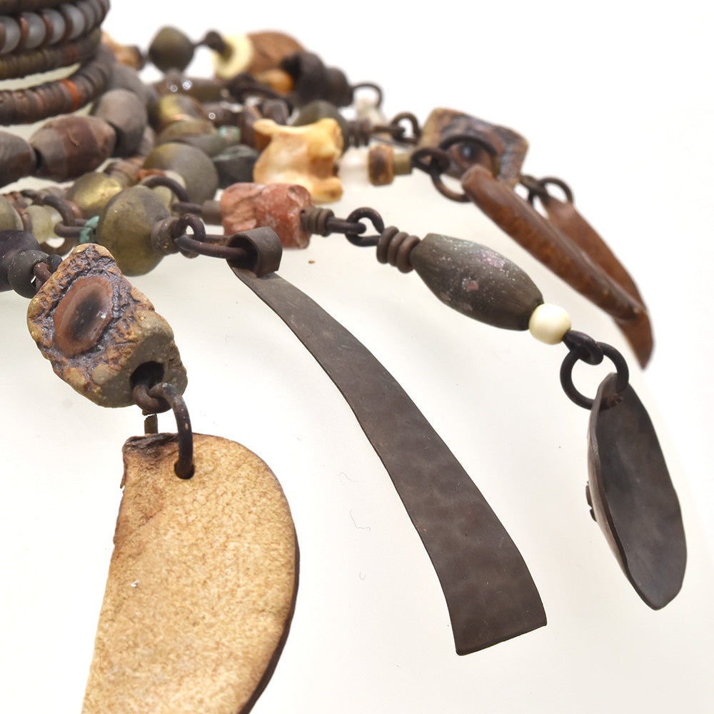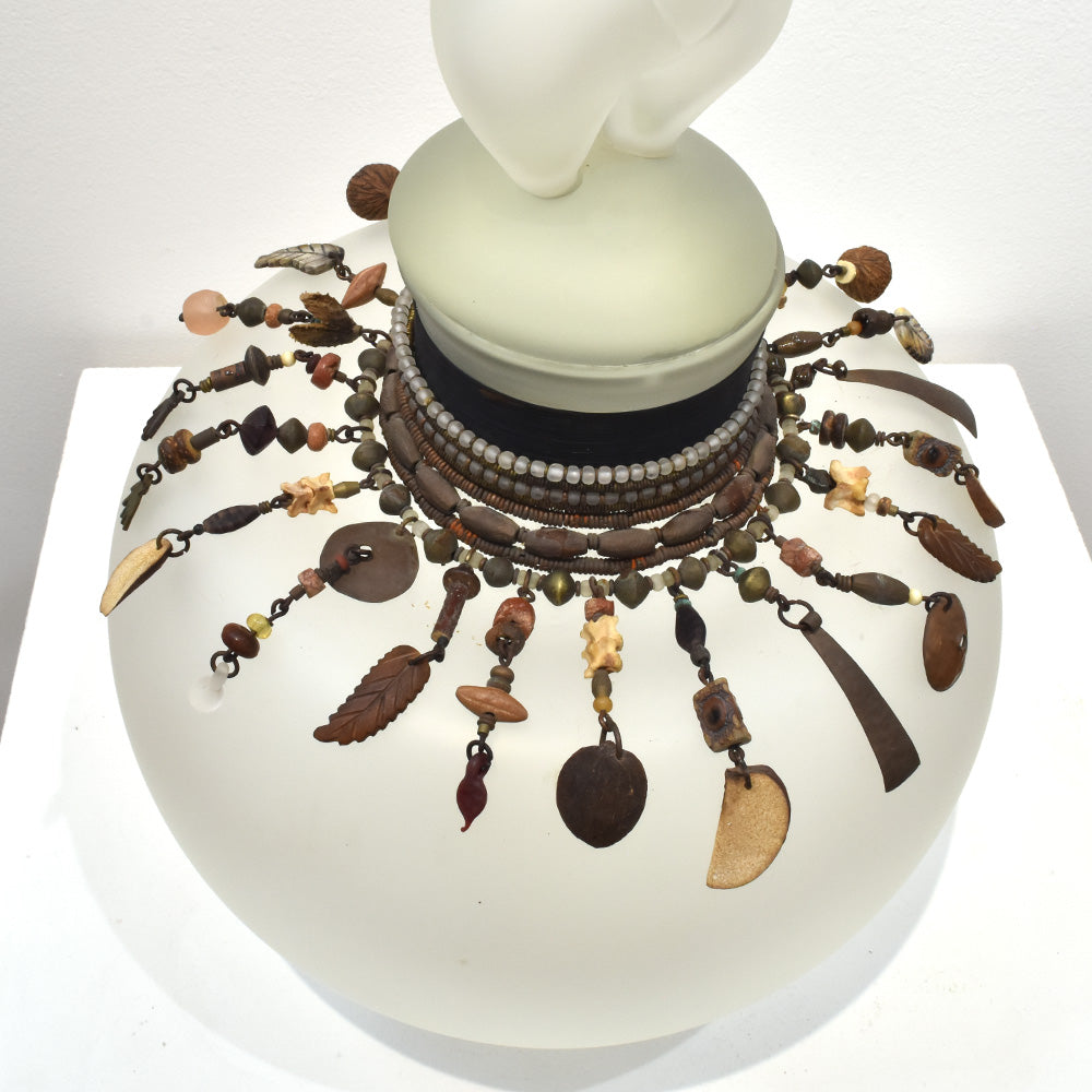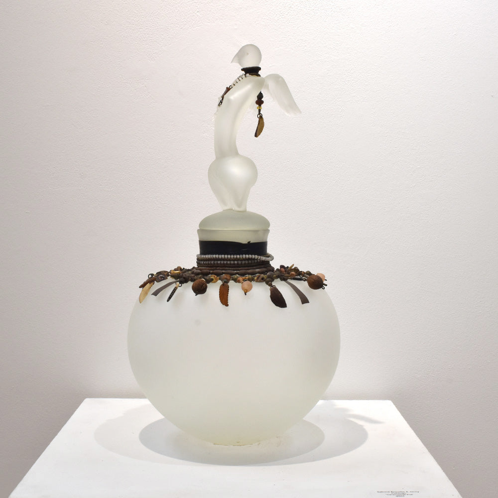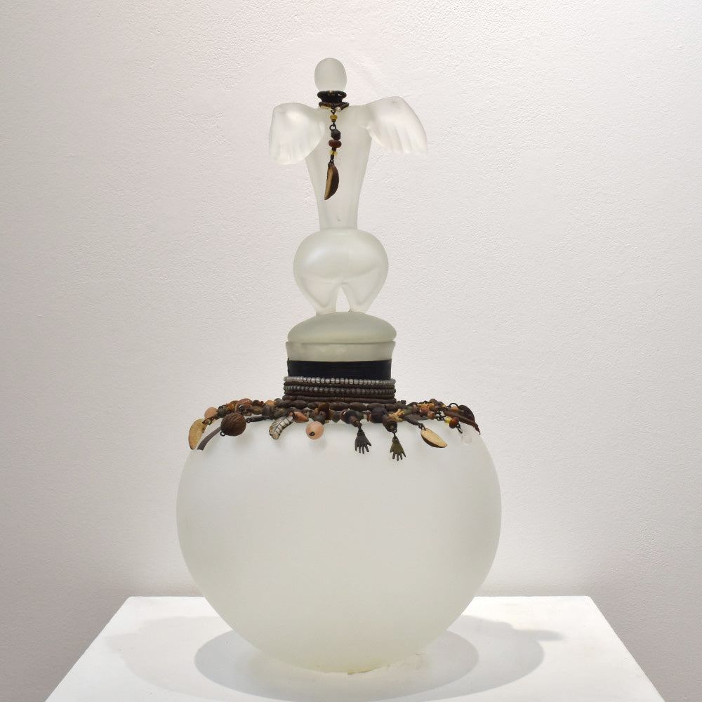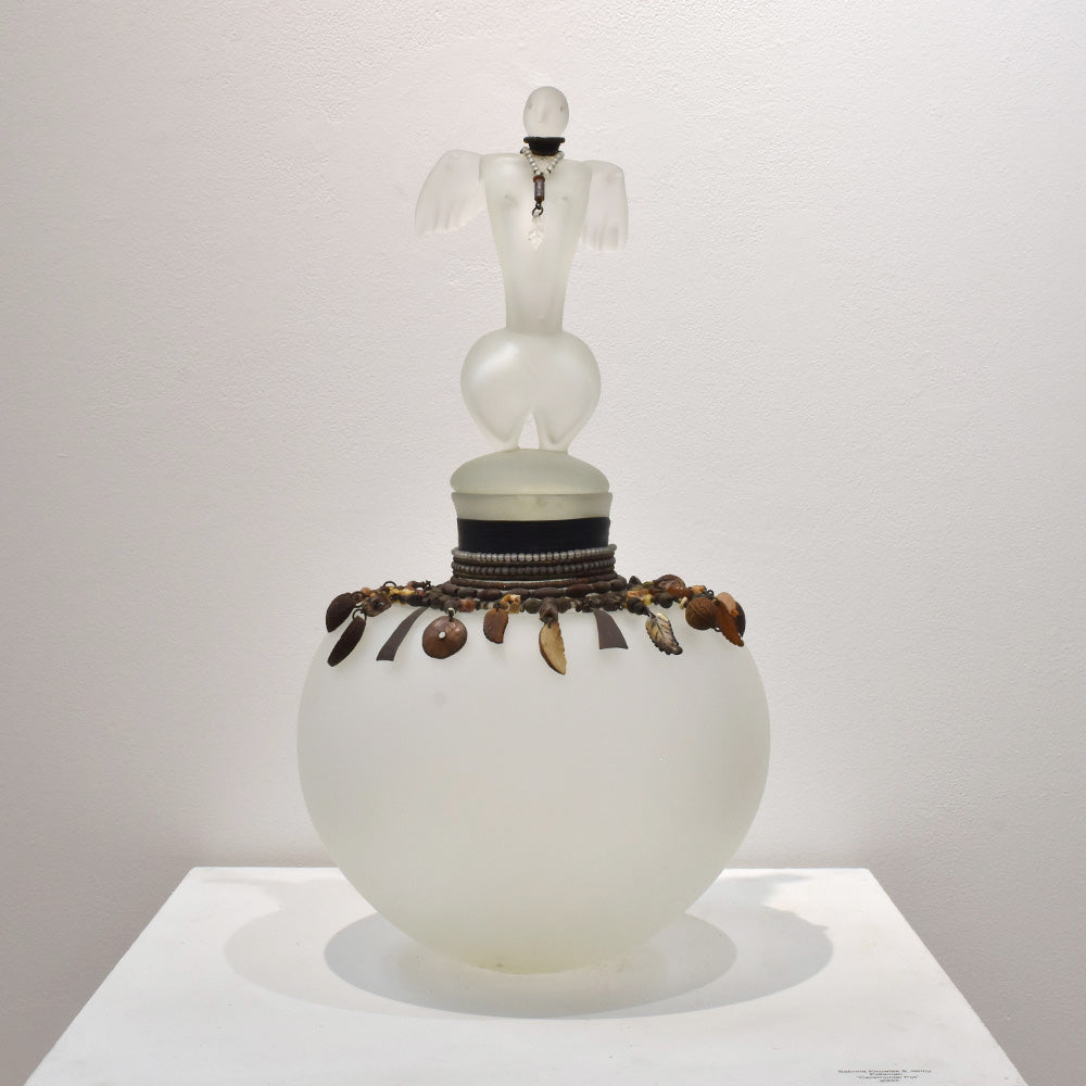 Blown and sculpted lid and pot adorned with african brass and copper beads. This piece was inspired by Sabrina and Jenny's 1997 backpacking journey through Zimbabwe and Botswana. This piece is very adorable and whimsical 1998. signed.