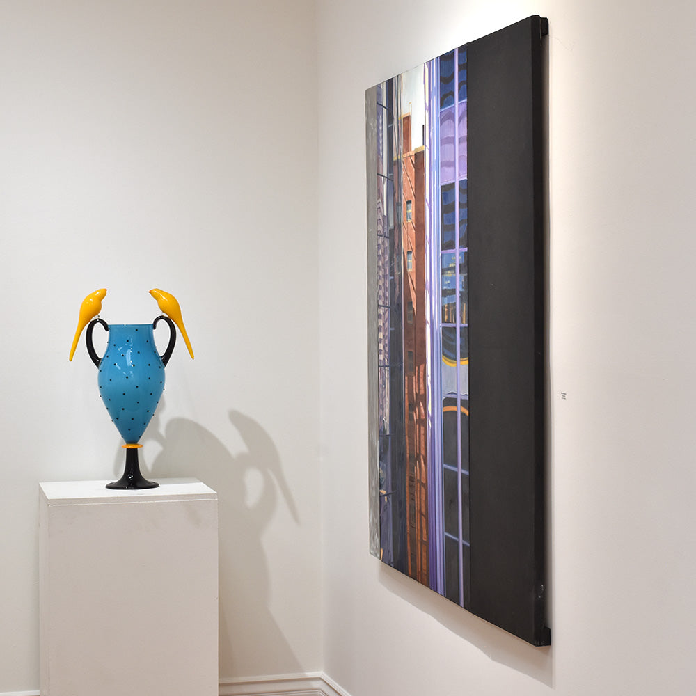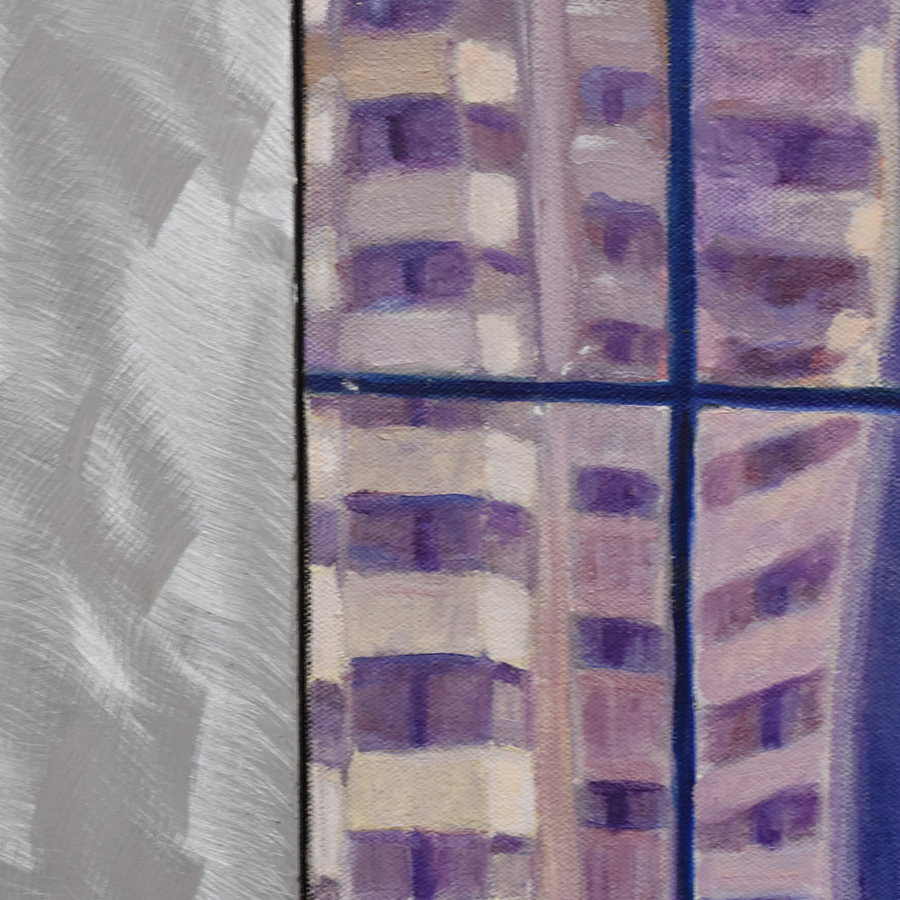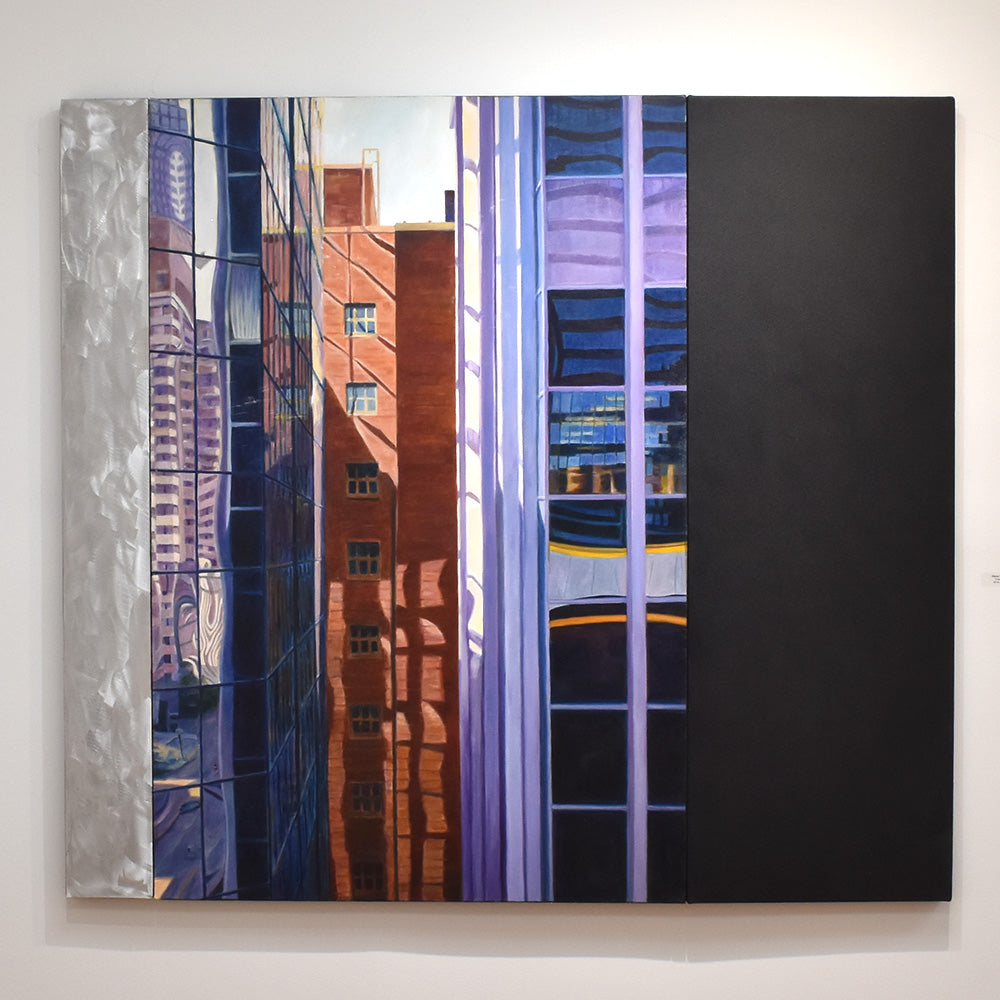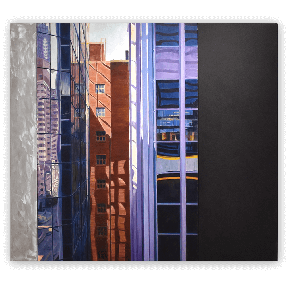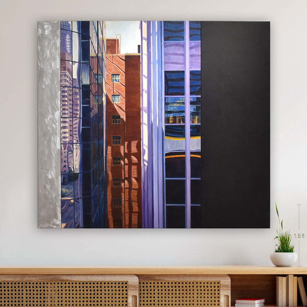 This artwork is a masterpiece by Steve Metzger, portraying an urban landscape composed of city buildings, representing the cityscape of the metropolis. The use of oil paint on canvas brings out the realistic depiction of buildings and the tangible composition between them, along with the intricate detailing. Moreover, the interplay of light and shadow passing through them is the highlight of this artwork. The incorporation of metallic materials enhances the modern feel of the realistic urban landscape, adding a touch of sophistication to the piece.