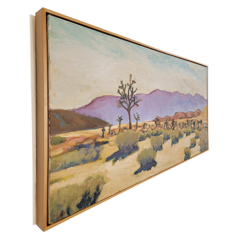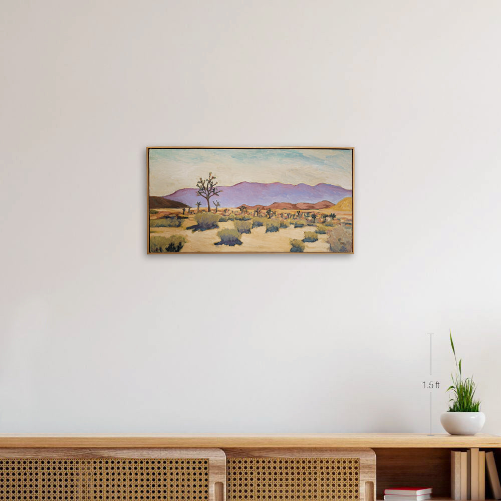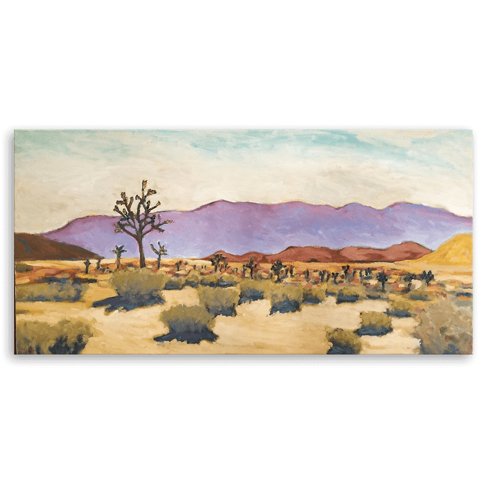Although it is a desert landscape composition that can easily be seen in California, the overall atmosphere of the painting is warm and gentle. The color sense that surrounds the repetitive, realistic shapes of bushes, which can easily be boring, with the purple mountain stands out, creating a modern atmosphere of the overall painting. The combination of delicate brushstrokes and many layers of color is also a work of art that conveys a soft beauty to the viewer.