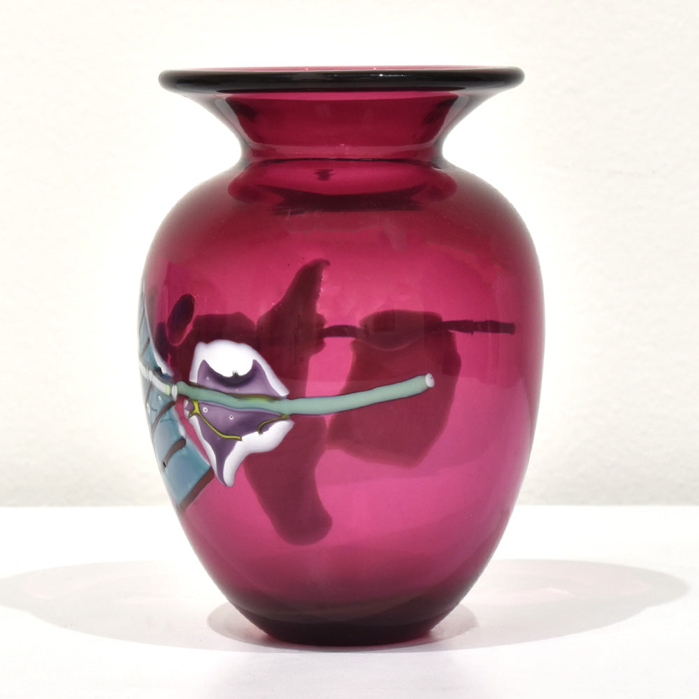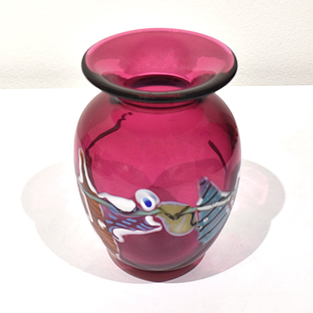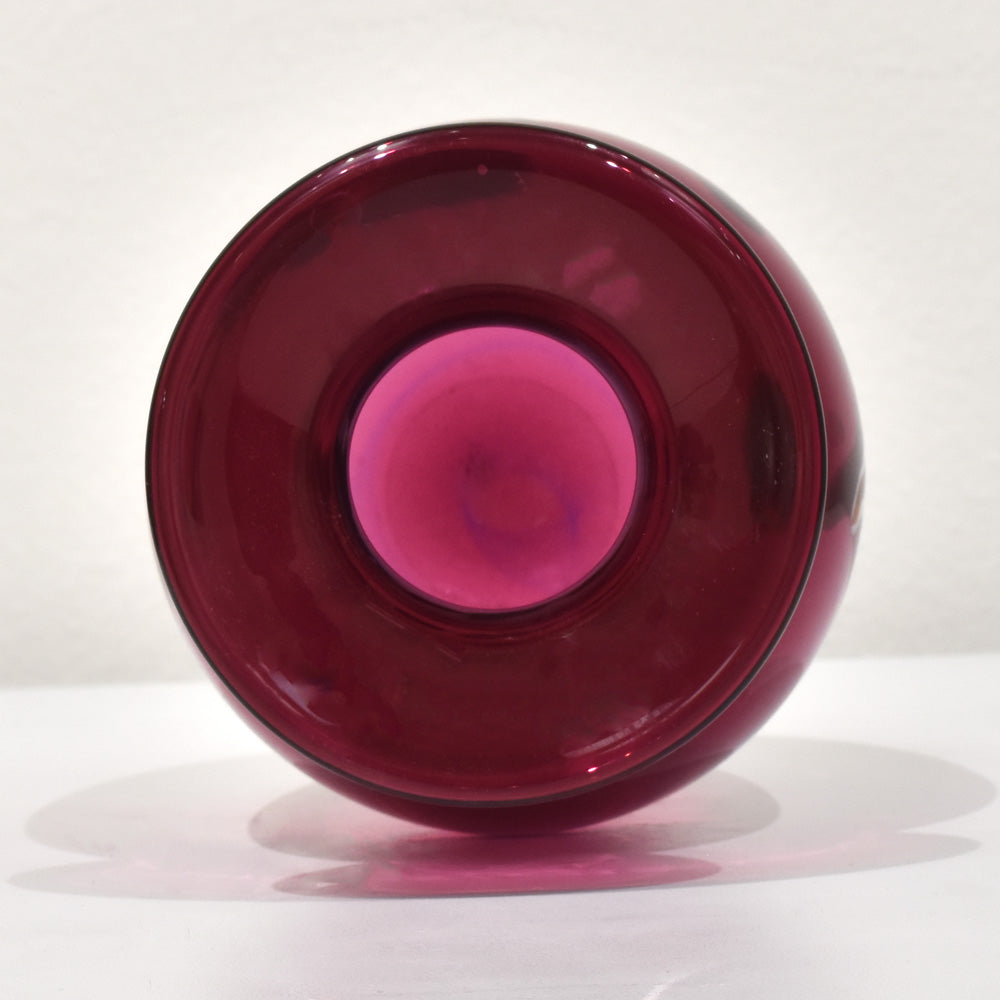 This glass bottle is made using the blown glass technique. The abstract lines and colors matching the main magenta color add beauty to it, making it a simple yet elegant glass bottle with a straightforward design. It serves as a decorative accent for interiors and can also be used as a vase.