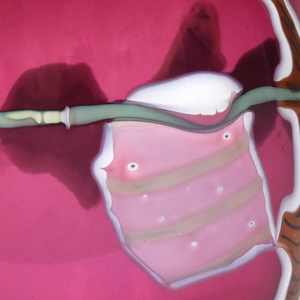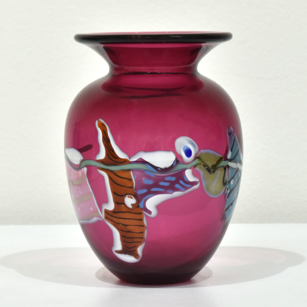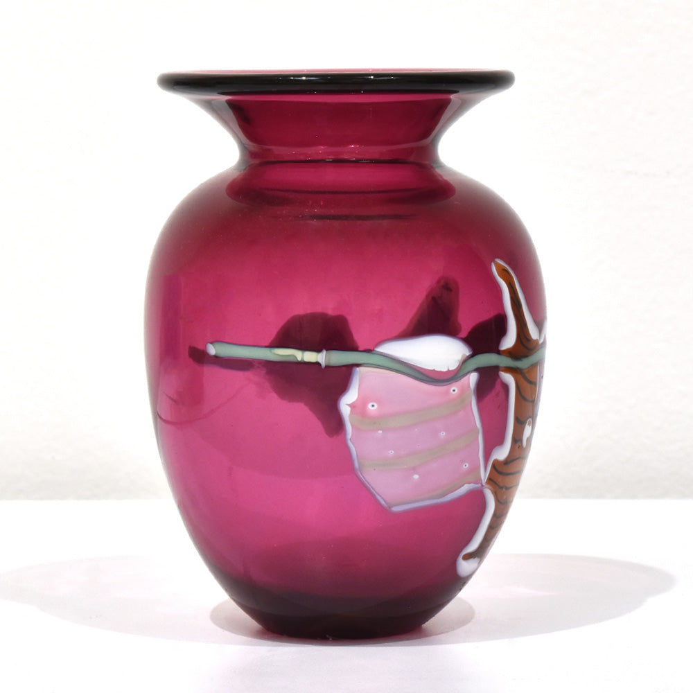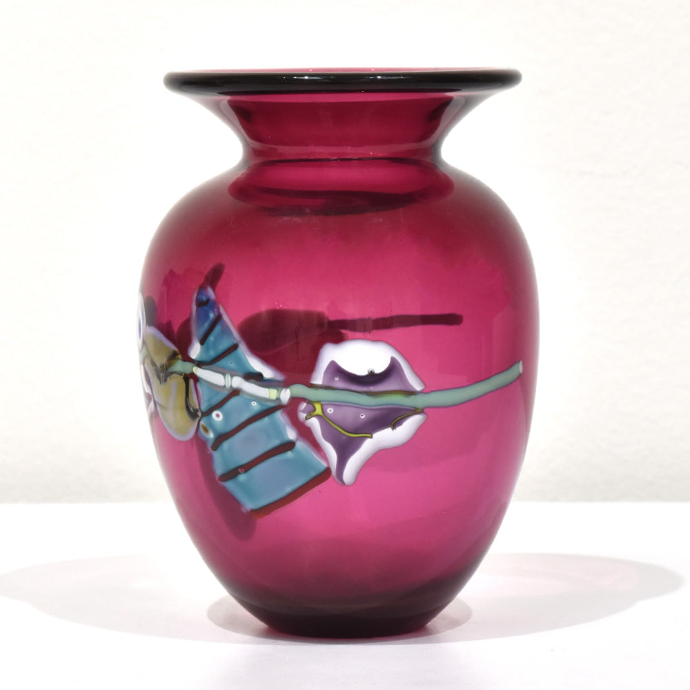 This glass bottle is made using the blown glass technique. The abstract lines and colors matching the main magenta color add beauty to it, making it a simple yet elegant glass bottle with a straightforward design. It serves as a decorative accent for interiors and can also be used as a vase.
