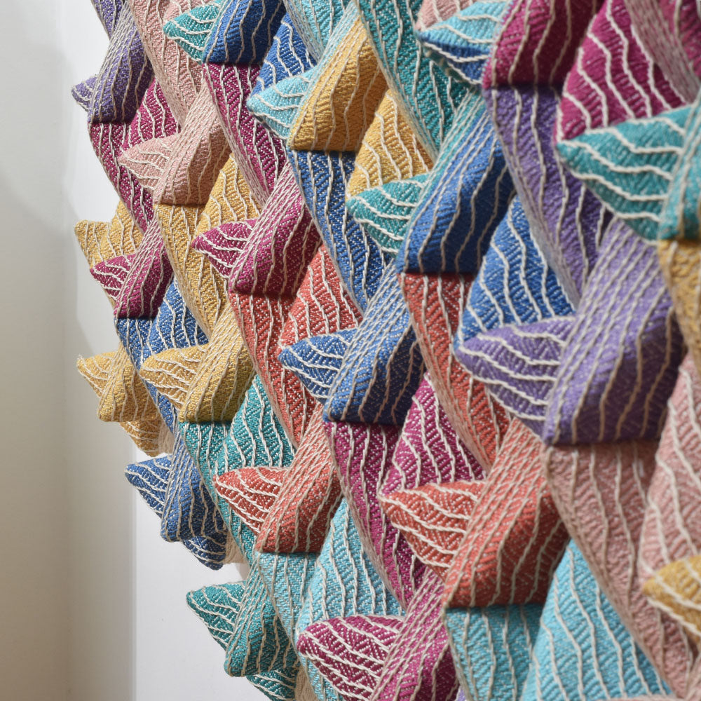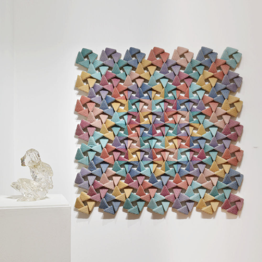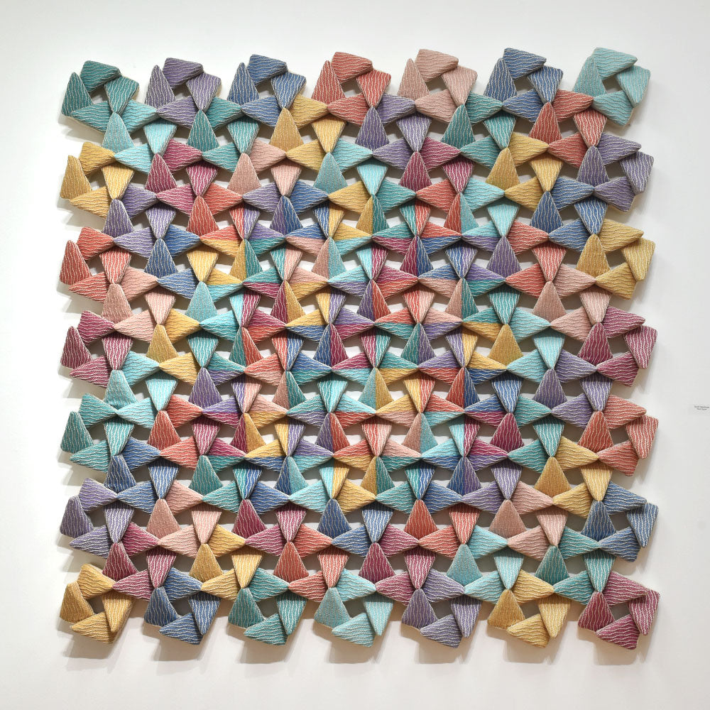 This artwork is made of 2D fabric. The artist used square shapes repeatedly to create the piece. By forming squares into triangular forms, combinations of these squares complete the large artwork, measuring 60x60 inches. The finalization process involves covering the formed foam with fabric. Although made with fabric, the artwork stands out with its beautiful arrangement and harmony of colors that evoke abstract imagery.