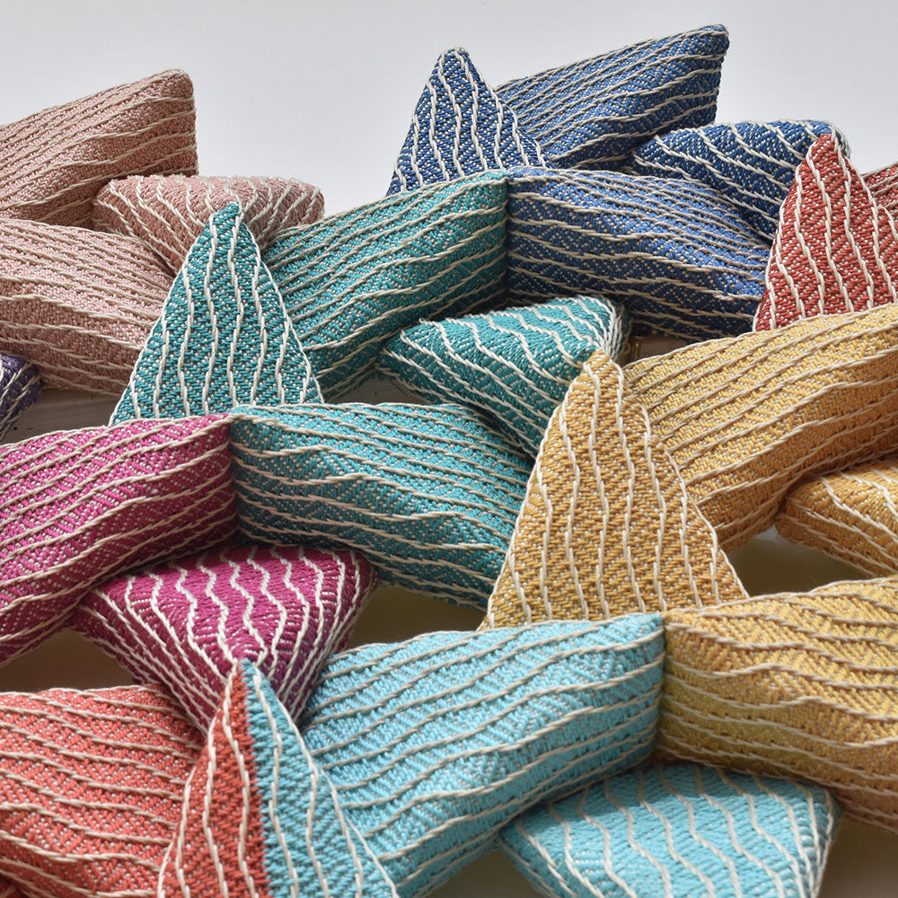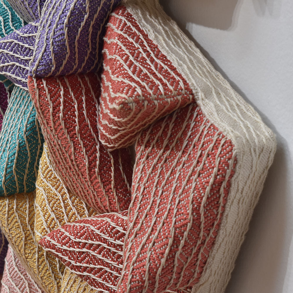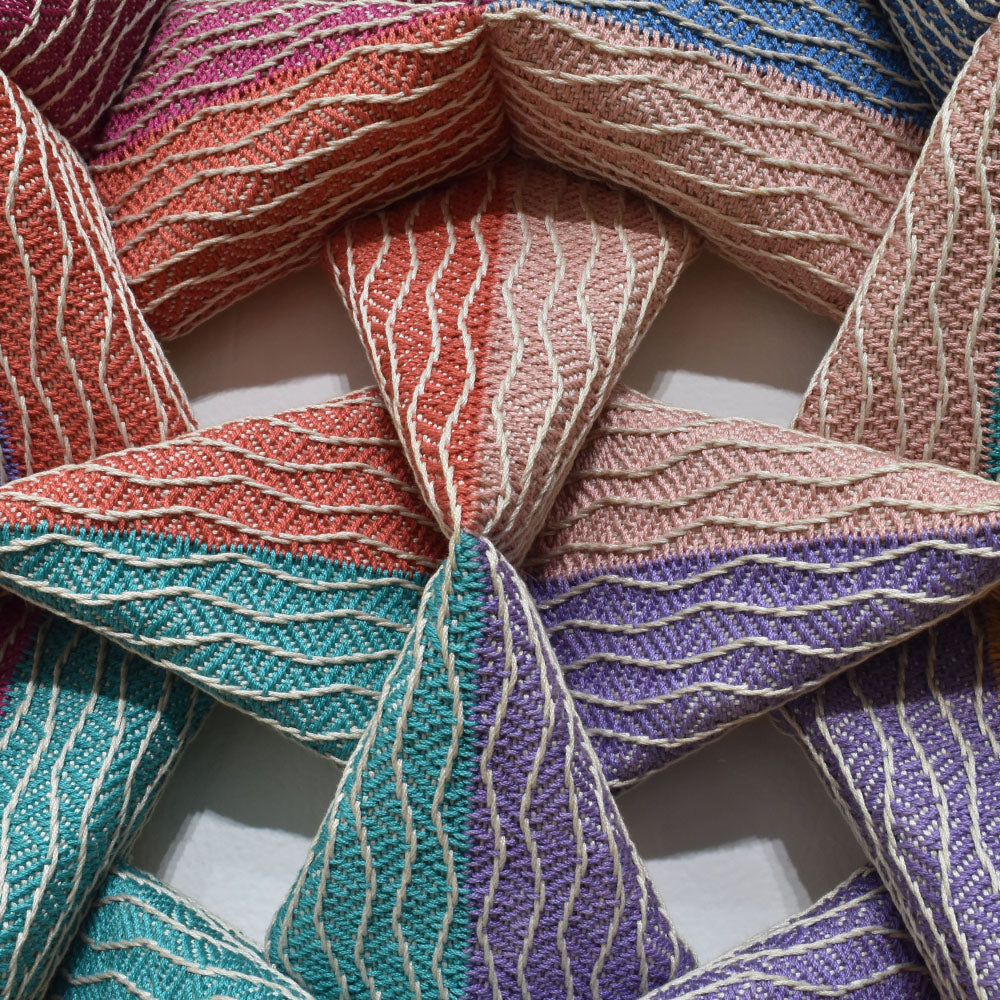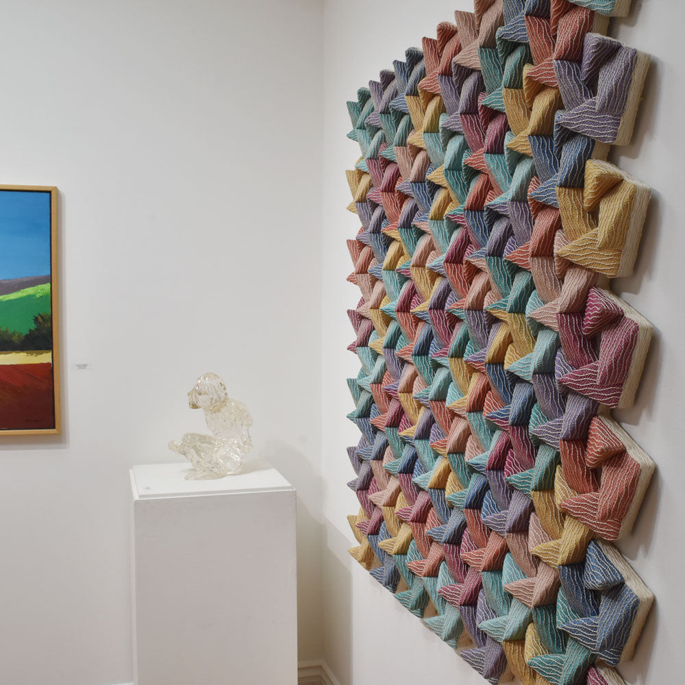 This artwork is made of 2D fabric. The artist used square shapes repeatedly to create the piece. By forming squares into triangular forms, combinations of these squares complete the large artwork, measuring 60x60 inches. The finalization process involves covering the formed foam with fabric. Although made with fabric, the artwork stands out with its beautiful arrangement and harmony of colors that evoke abstract imagery.