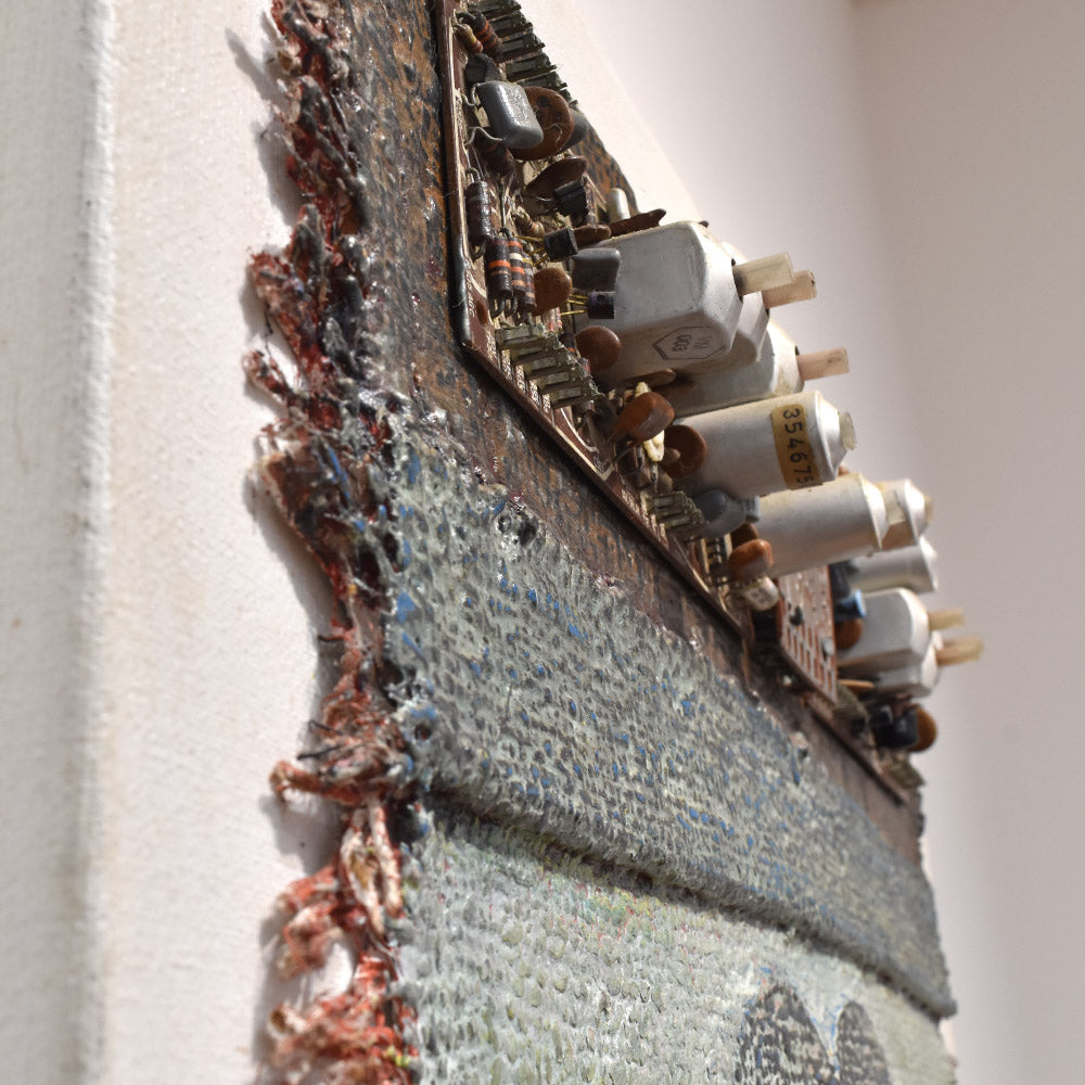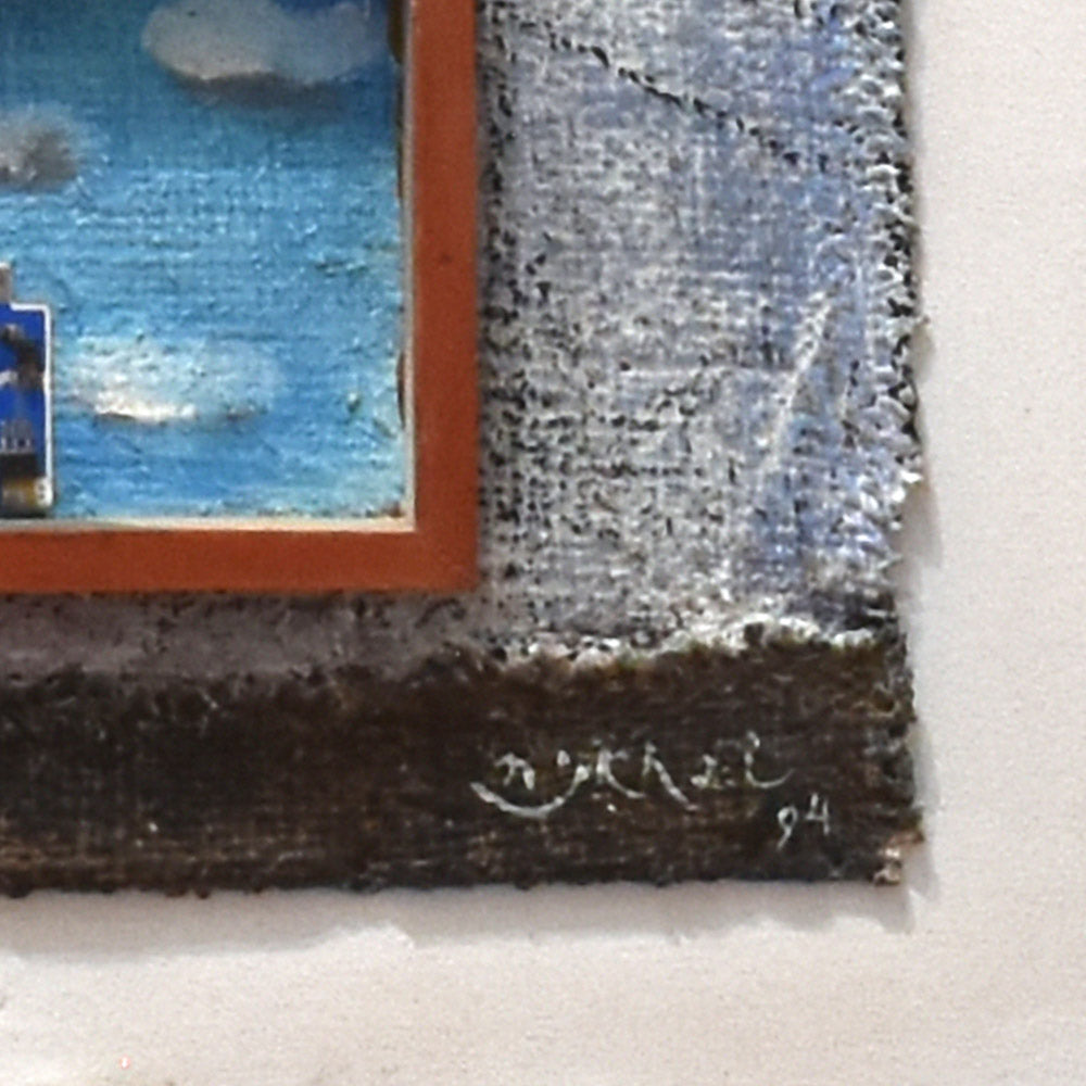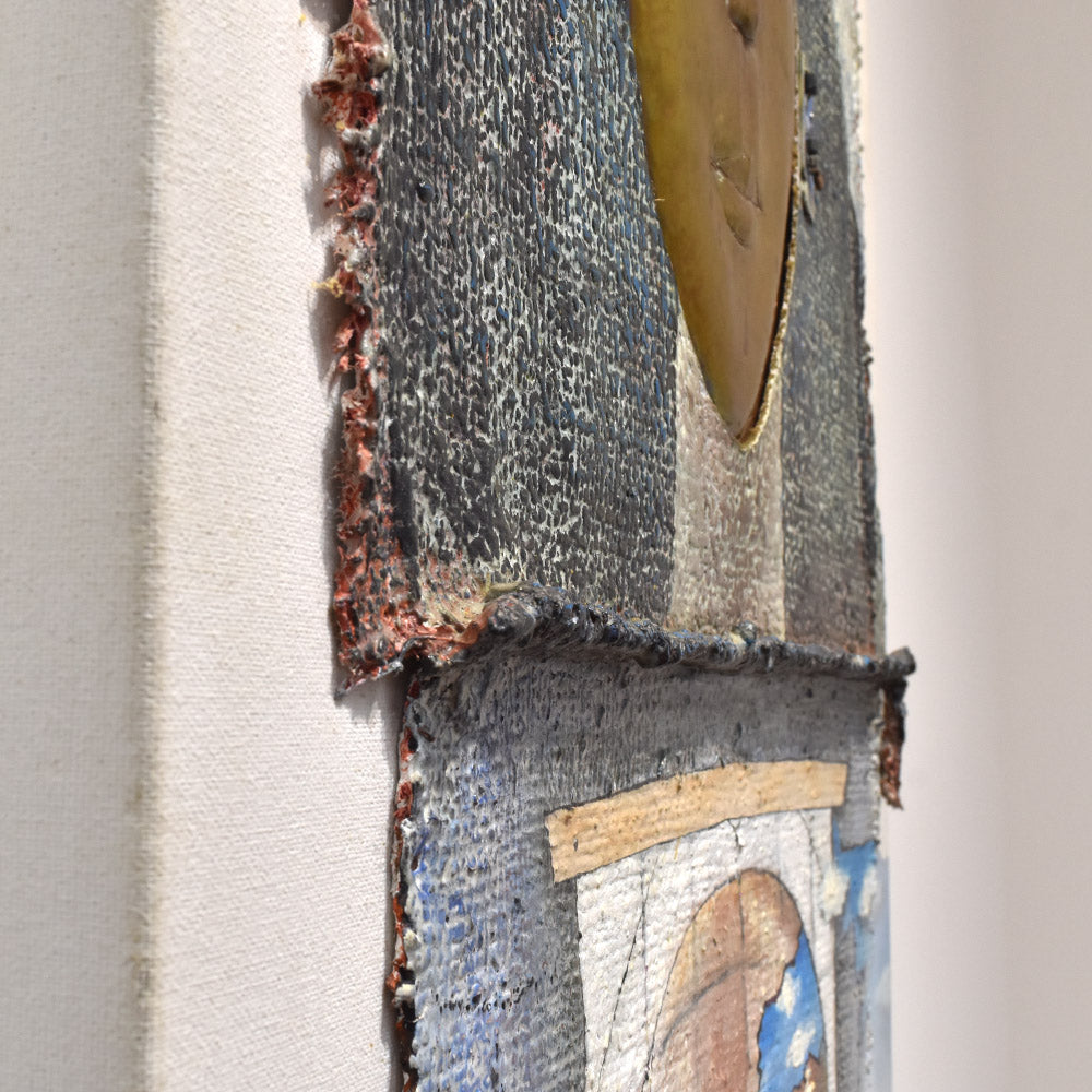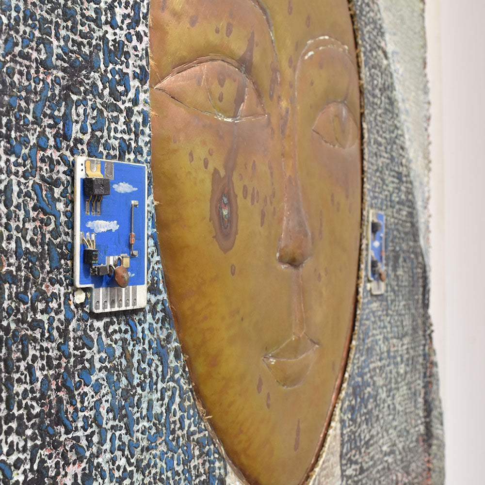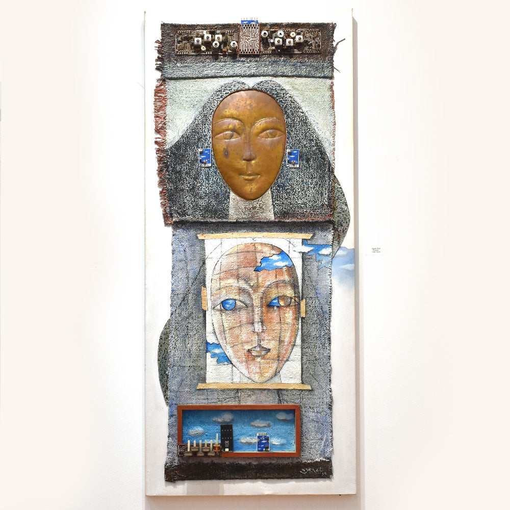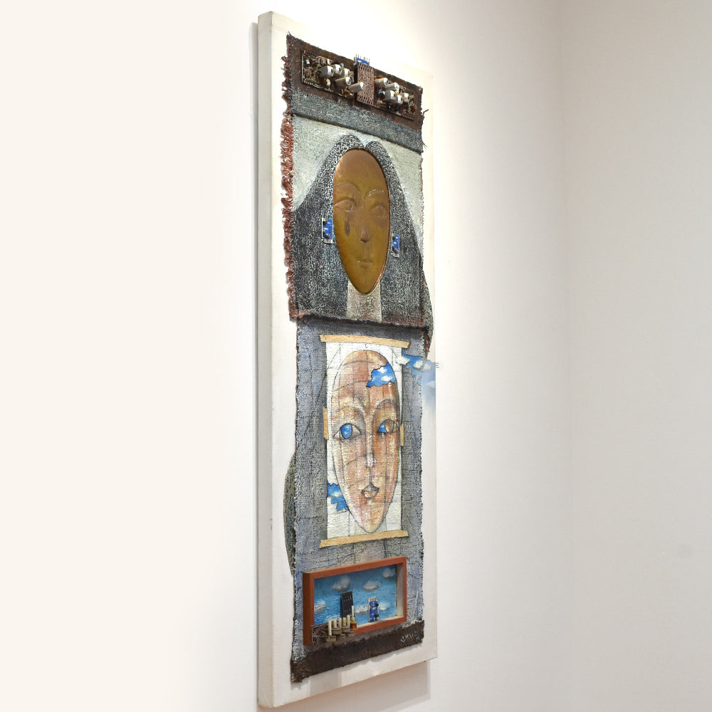 This piece was exhibited at the Turstin Renaissance Gallery in 1996. Kai is a Vietnamese artist who settled in Orange County, California, as a first-generation immigrant from Vietnam. His works in the United States, following a solid artistic foundation, are much more modern than before. This piece seems to represent either himself or the immigrant experience. Acrylic paint on canvas is the primary medium, mixed with various other media to captivate viewers with a contemporary sensibility. Incorporating elements like rice paper or computer chips into the artwork demonstrates remarkable artistic creativity. It conveys a message of coexistence between the past, present, and future.