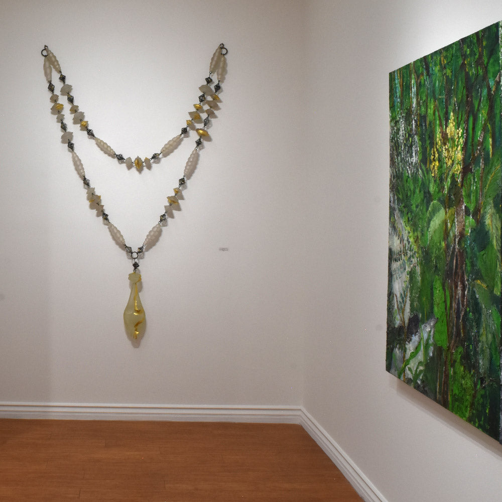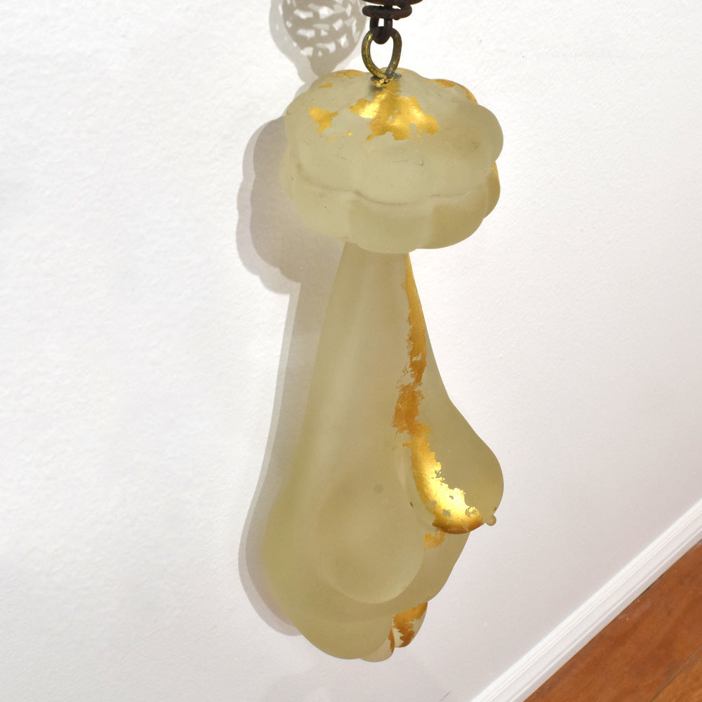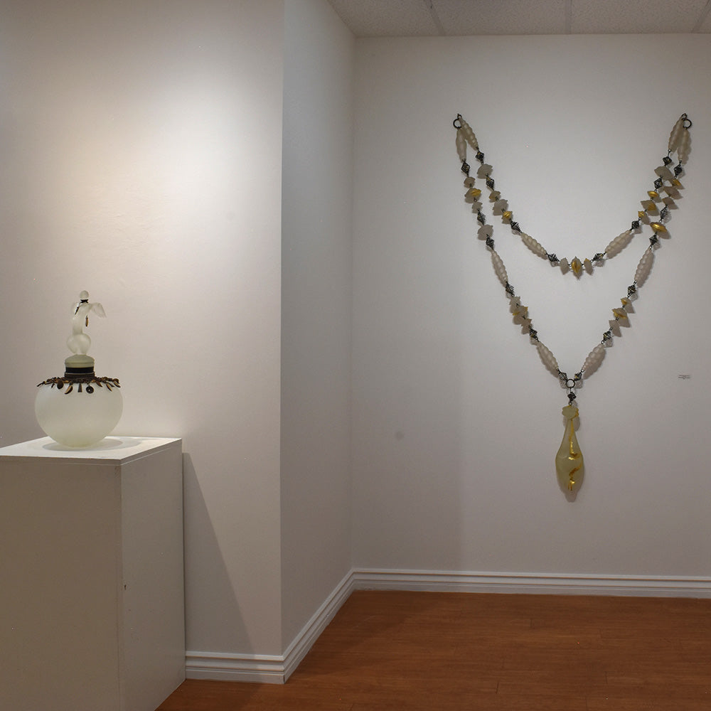 This artwork, created by Jenny Pohlman and Sabrina Knowles, is crafted in the form of rosary beads. Using the technique of frosted glass and gilding, the combination of bead shapes creates a mysterious ambiance. Each piece is connected in a repetitive pattern using metal loops, resembling a large necklace. The display can be adjusted to a narrow or wide width depending on the wall space.
