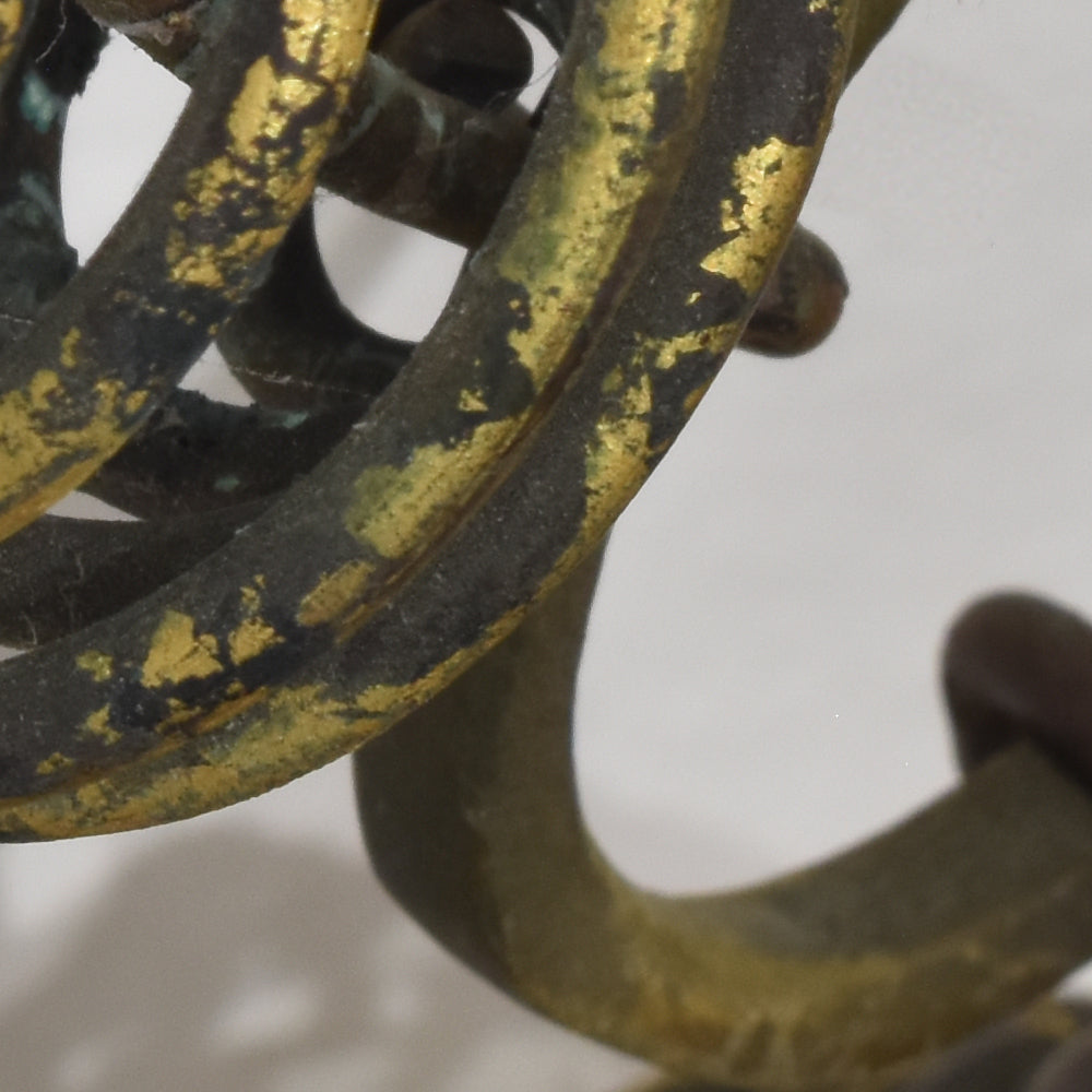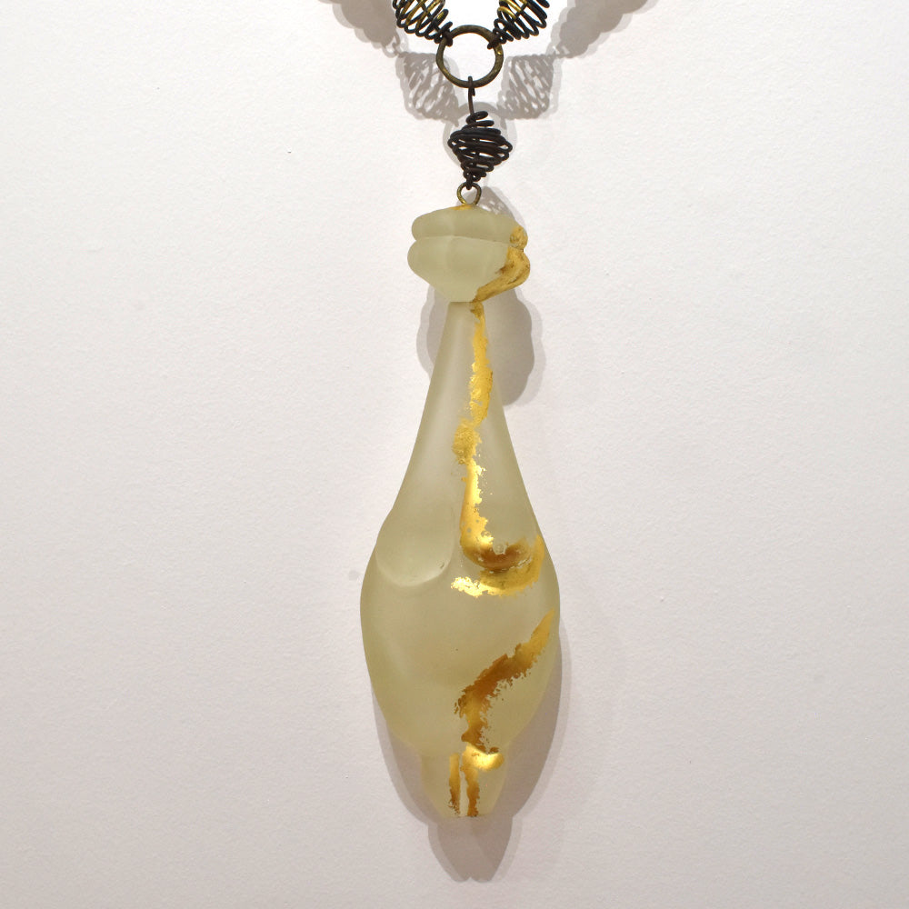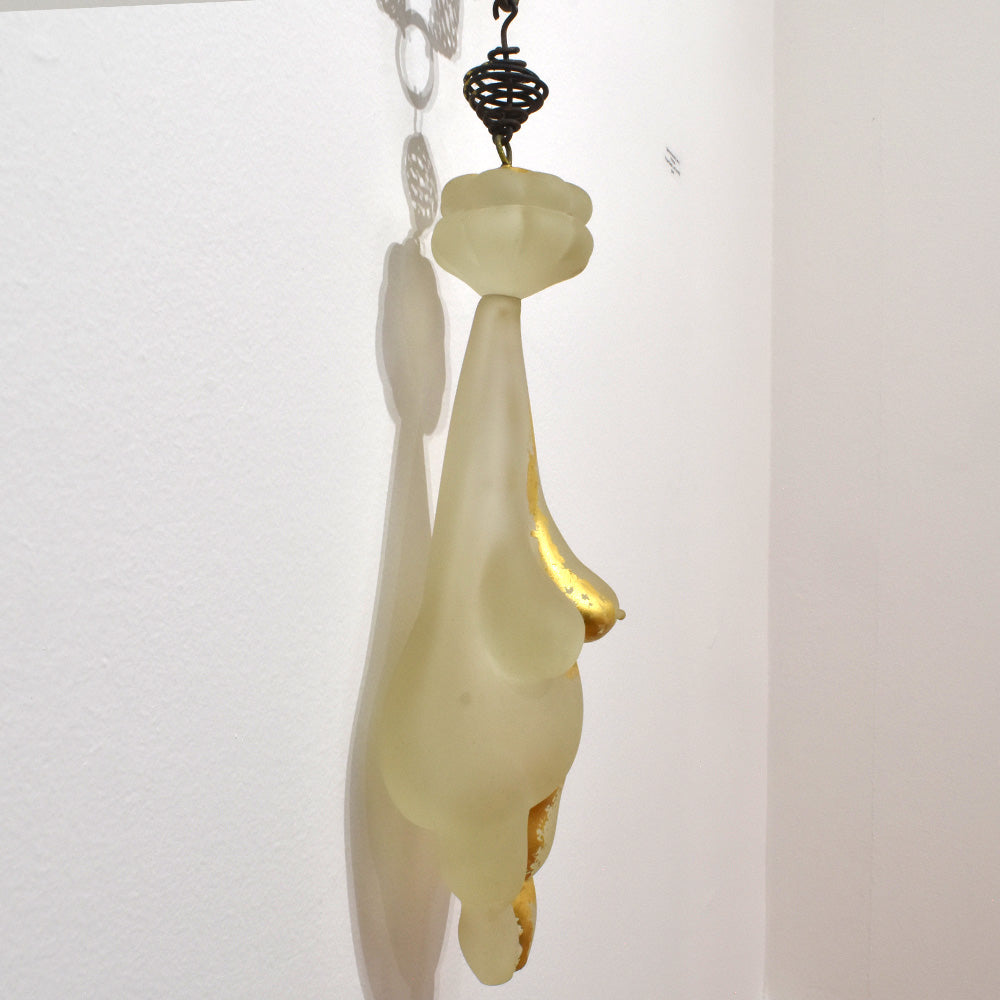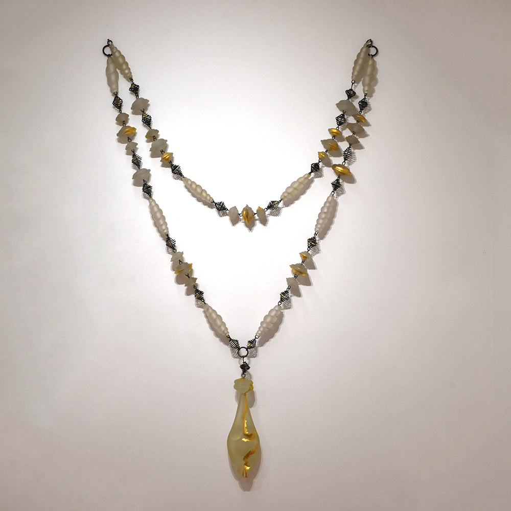 This artwork, created by Jenny Pohlman and Sabrina Knowles, is crafted in the form of rosary beads. Using the technique of frosted glass and gilding, the combination of bead shapes creates a mysterious ambiance. Each piece is connected in a repetitive pattern using metal loops, resembling a large necklace. The display can be adjusted to a narrow or wide width depending on the wall space.