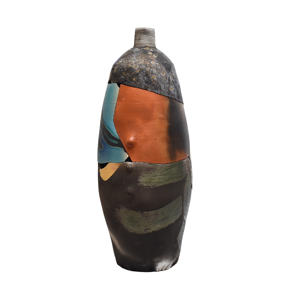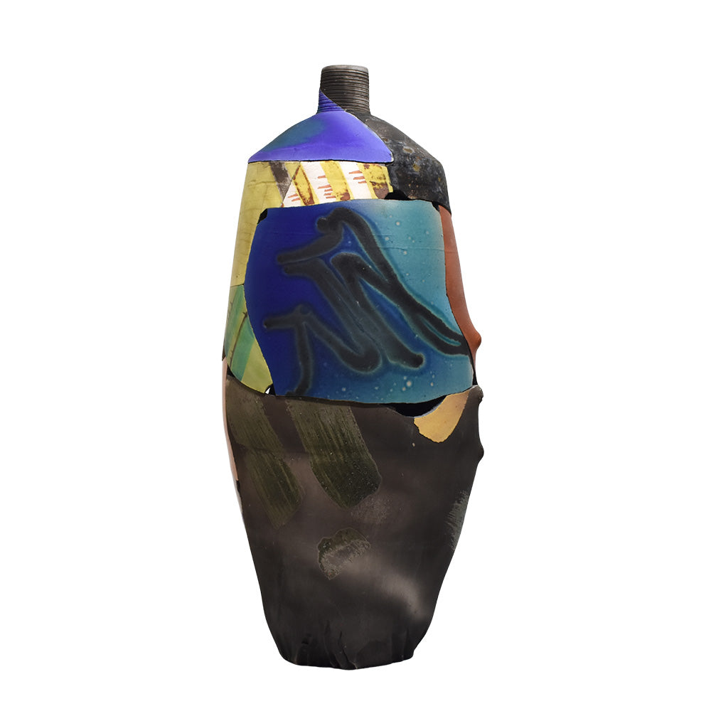 Patrick Shia Crabb(1947- ) is a sculptor known for his “deconstruction style” tall vessels, large wall platters and figurative sculptures. Hand building, throwing and the use of unique molds are all used to create his unique forms.