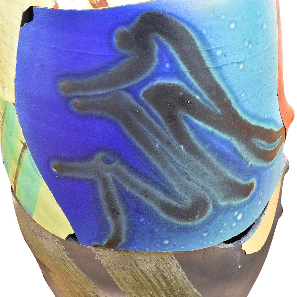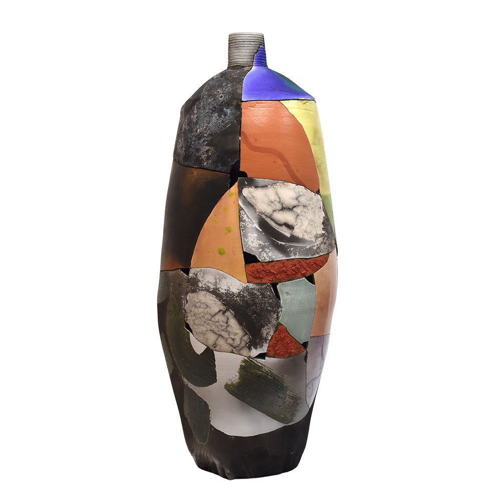 This artwork can be considered a quintessential example of the "deconstruction style" prevalent in the 1990s. Fragments of pottery are utilized to reconstruct broken forms, with each piece individually fired or glazed before being reassembled into their original shapes. The fragments reflect antiquity, while the bright patterns and colors are indicative of contemporaneity. It is a remarkable piece of postmodernist lacquer sculpture pottery, characterized by the harmonious balance of size, form, color, and pattern.
