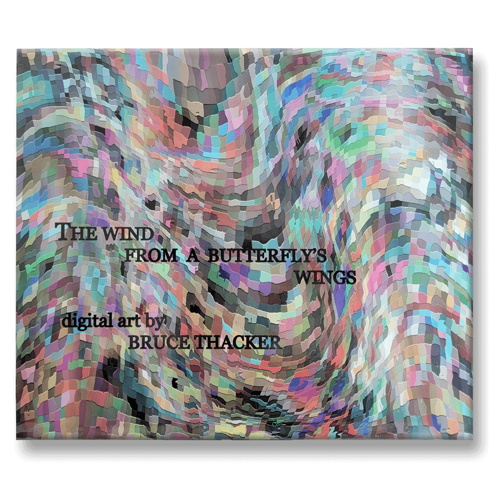 The art book "The Wind from A Butterfly’s Wings" is a collection of digital artworks by digital artist Bruce Thacker. It features a selection of 140 works created since the early 2000s. The contents of the book showcase the artist's vibrant and experimental works created using various techniques in computer art. The book is printed entirely in color, with a luxurious hardcover for the cover. It was published by Blurb Publishing Co.